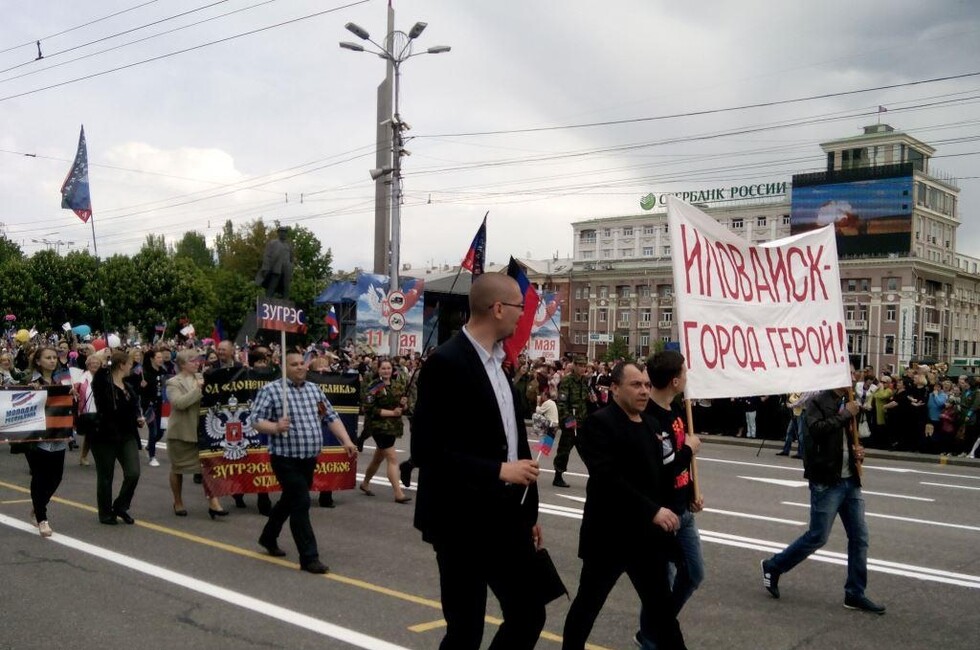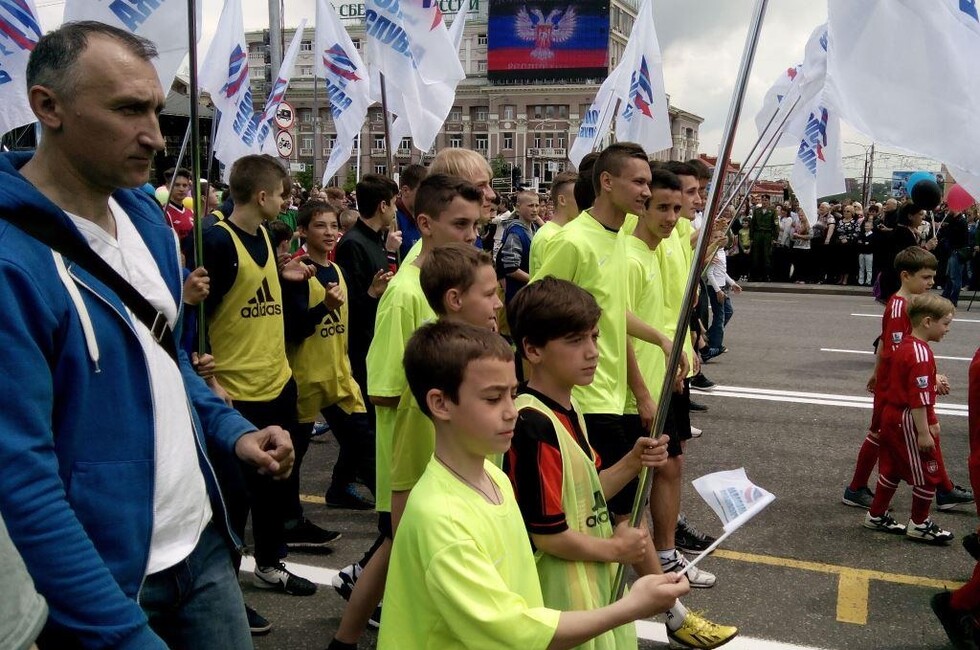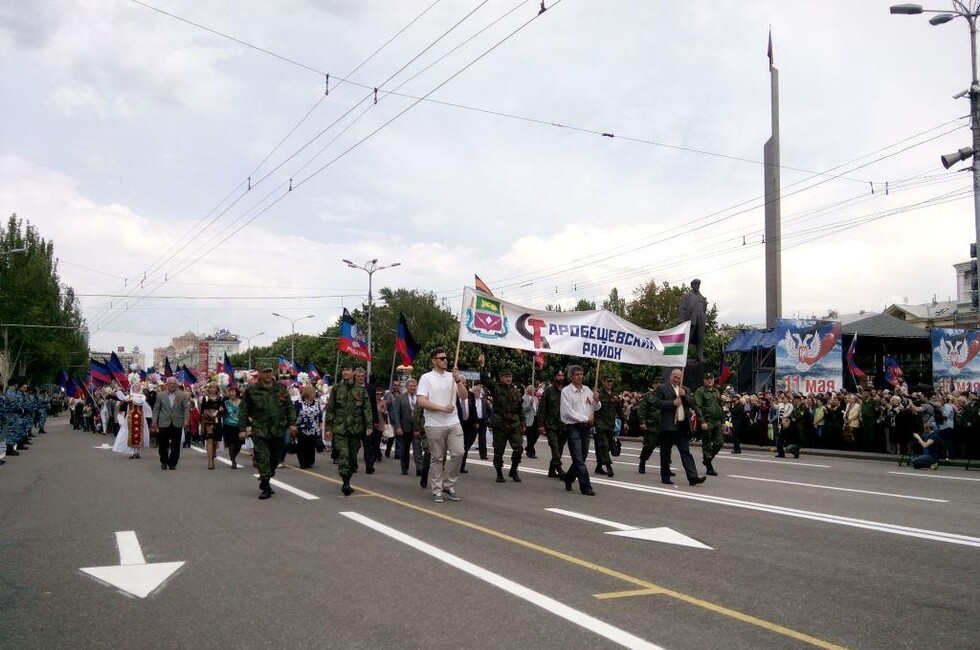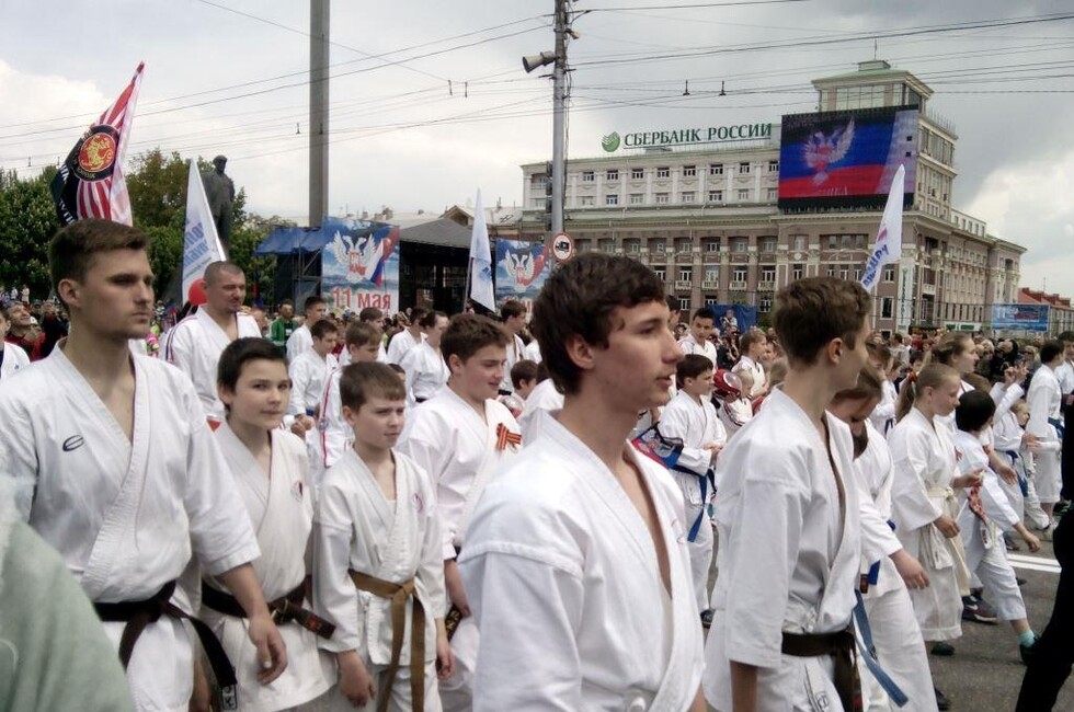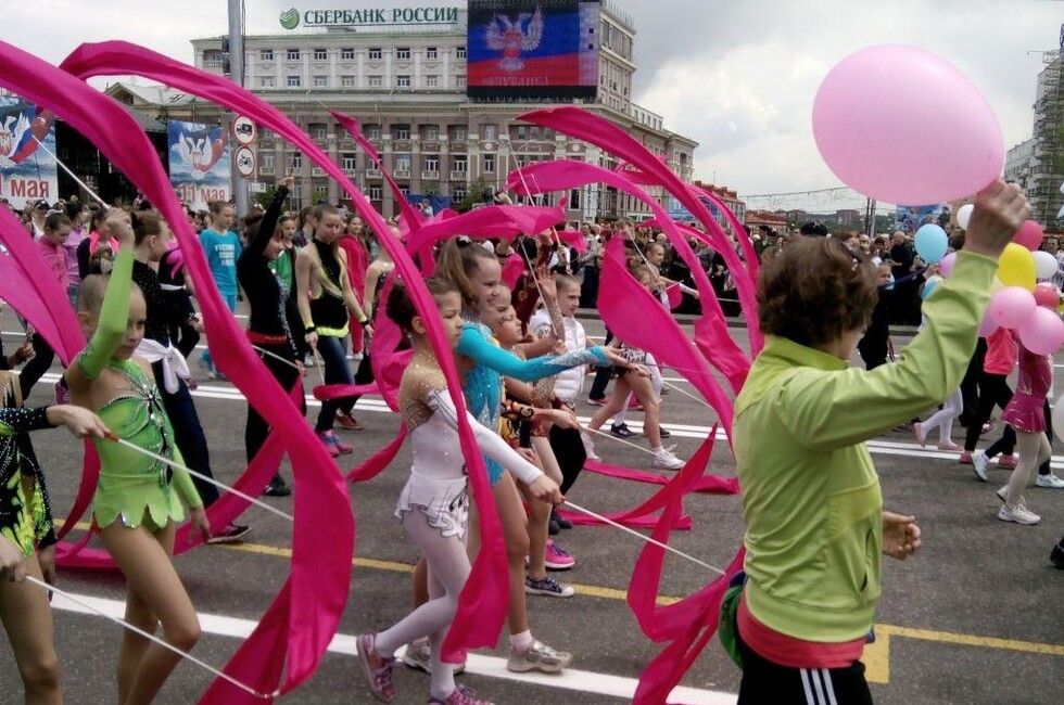 В числе спортсменов группа альпинистов, в День Победы водрузившая флаг Донецкой Народной Республики на Эльбрус. Выделились в праздничной колонне жители Снежного, которые принесли Георгиевскую ленту длиной несколько десятков метров. Праздничный марш продолжается.