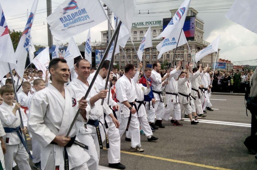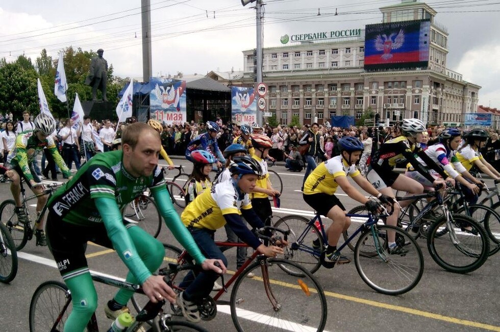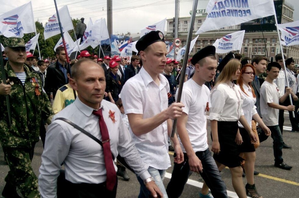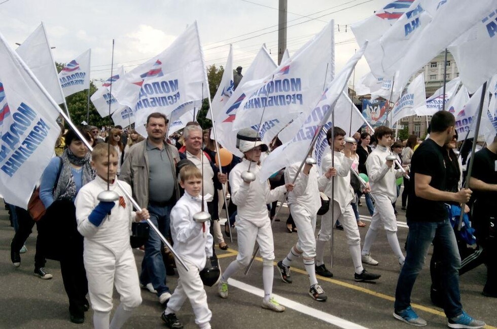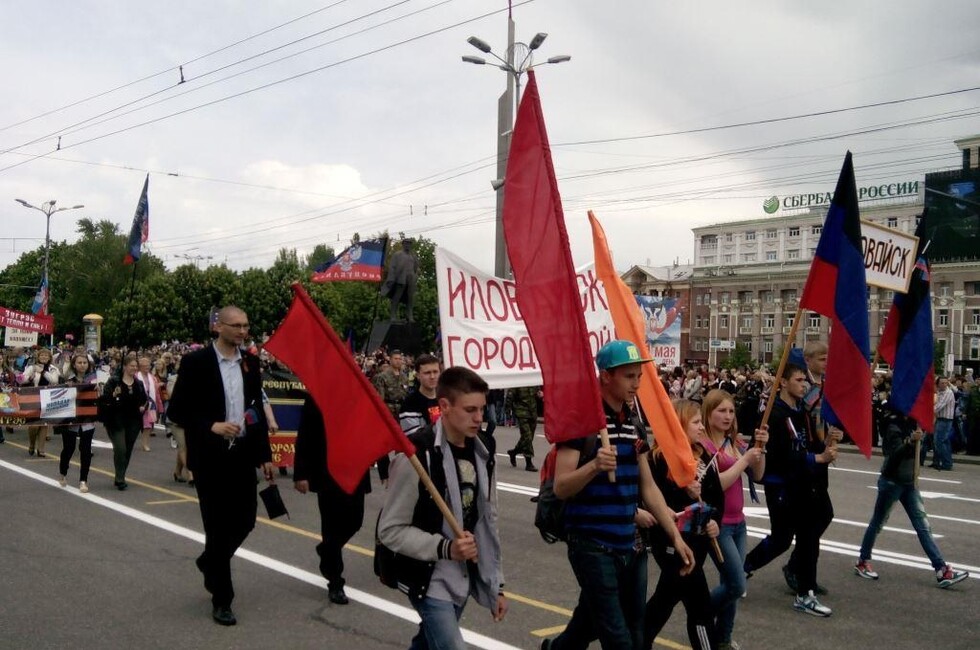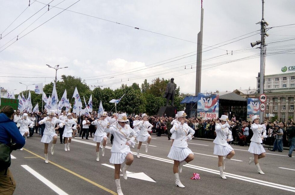 В числе спортсменов группа альпинистов, в День Победы водрузившая флаг Донецкой Народной Республики на Эльбрус. Выделились в праздничной колонне жители Снежного, которые принесли Георгиевскую ленту длиной несколько десятков метров. Праздничный марш продолжается.