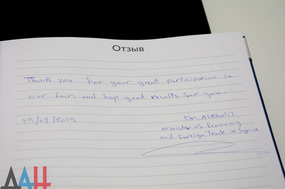 «Вчера (делегация ДНР - прим. ДАН) вернулась из Сирийской Арабской Республики, где приняла участие в промышленной выставке, - сказал Пушилин. - Сейчас преждевременно оценивать коммерческую целесообразность мероприятия, но хочу подчеркнуть следующее - был преодолен очередной рубеж на пути к обретению Донецкой Народной Республикой международного признания, сделан значительный шаг к установлению диалога с мировым экономическим сообществом».
