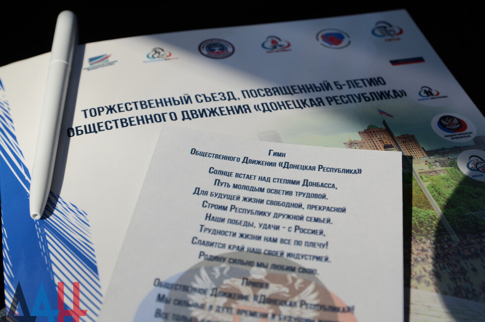 Также в ходе съезда был исполнен и утвержден гимн движения. Над ним работала группа авторов: слова написал донецкий автор и исполнитель Андрей Старинцев, известный работой над текстом песни «Россия – Родина мать», музыку – композитор и звукорежиссер из Макеевки Сергей Бардин. Соавтором и аранжировщиком выступил звукорежиссер, автор гимна ДНР, заслуженный работник культуры Михаил Хохлов. Исполнил гимн движения артист Донецкого государственного академического музыкально-драматического театра им Бровуна Алексей Аносов.