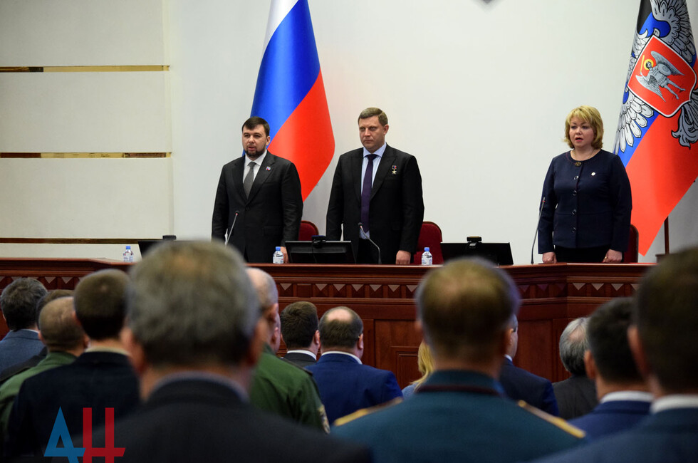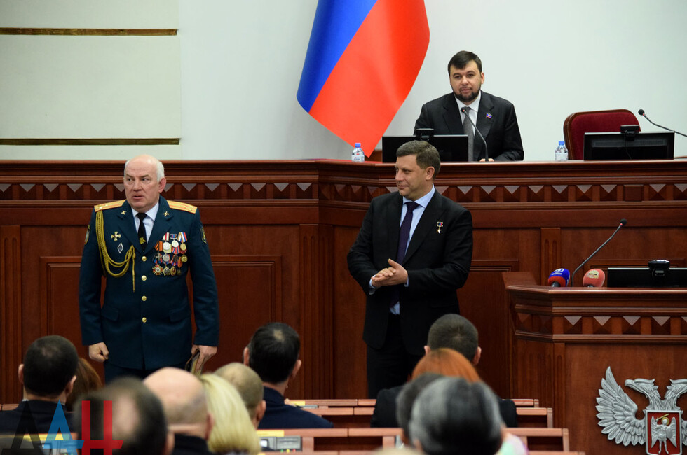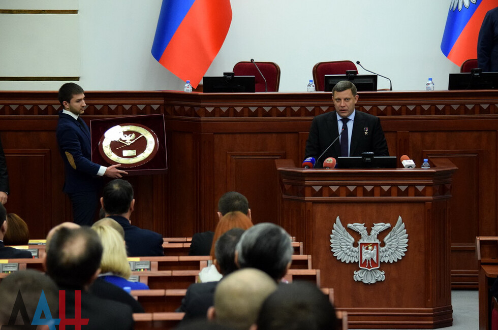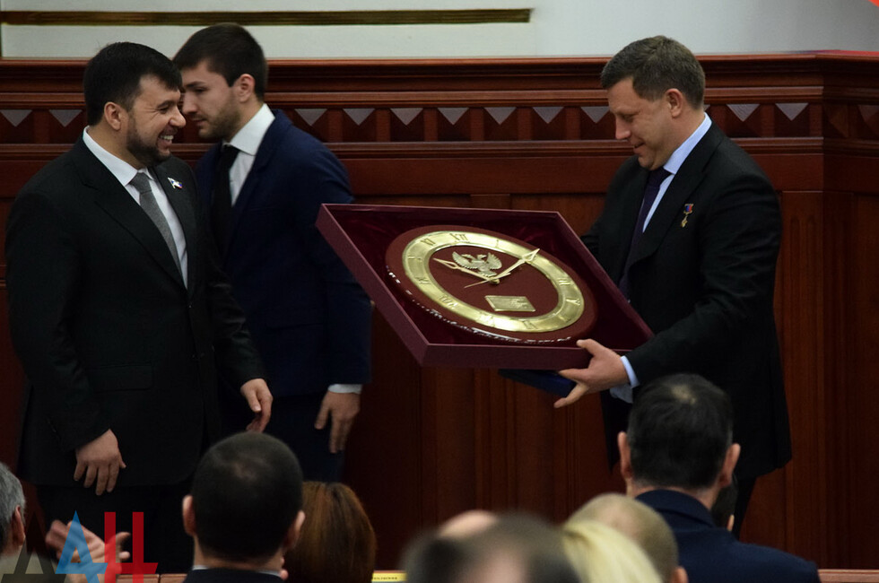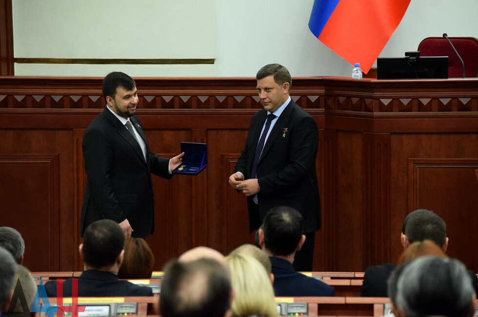 В свою очередь, председатель парламента Денис Пушилин вручил Главе ДНР почетный знак Народного Совета.