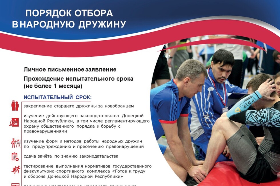 По словам Муратова, народные дружины будут оказывать содействие правоохранительным органам в охране общественного порядка, принимать участие в организации и проведении различных спортивных мероприятий, в частности по сдаче норм ГТО («Готов к труду и обороне»). Дружинниками могут стать жители ДНР возрастом от 18 лет с хорошим уровнем физической подготовки и имеющие достижения в спорте.