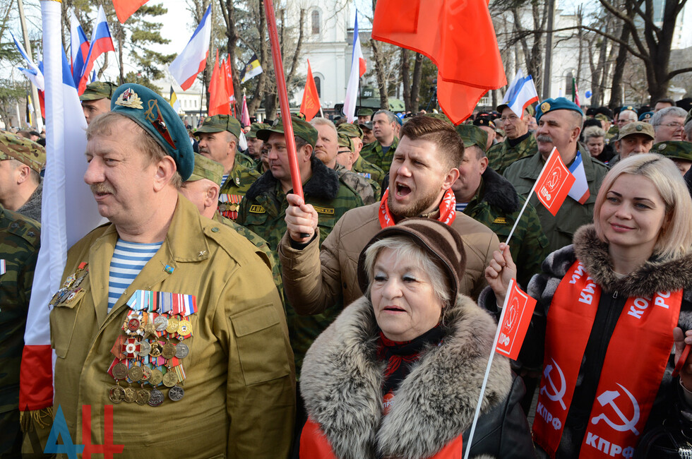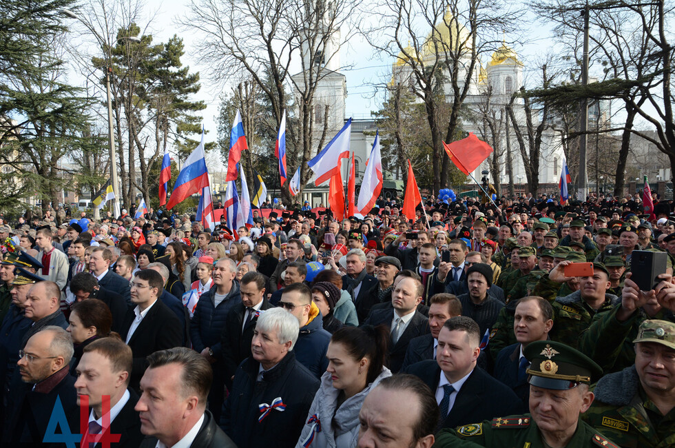 Официальная часть началась с возложения цветов к памятнику Народному ополчению всех времен, расположенному у здания правительства Крыма. После этого состоялось многотысячное праздничное шествие. Колонна прошла по главным улицам крымской столицы к зданию Госсовета, где был организован митинг. Со сцены поочередно выступили представители руководства республики, другие политические деятели России. Мероприятие сопровождалось выступлением творческих коллективов. Затем в здании Госсовета прошло торжественное собрание.