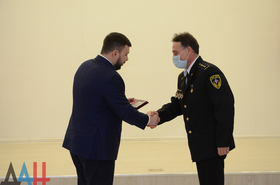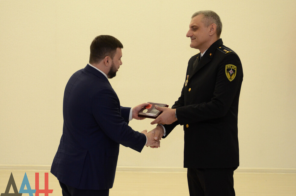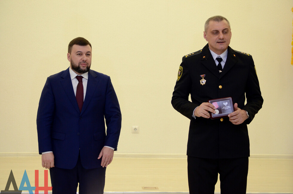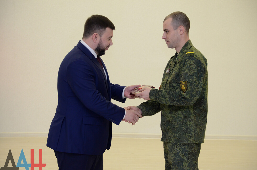 В завершение встречи Глава ДНР вручил семь медалей «За отвагу» военнослужащим Народной милиции и горноспасателям МЧС Республики за мужество, проявленное при исполнении воинского и служебного долга, и по случаю Года Великой Победы.