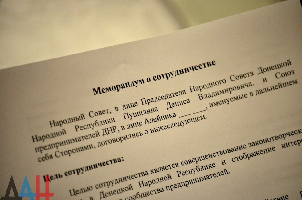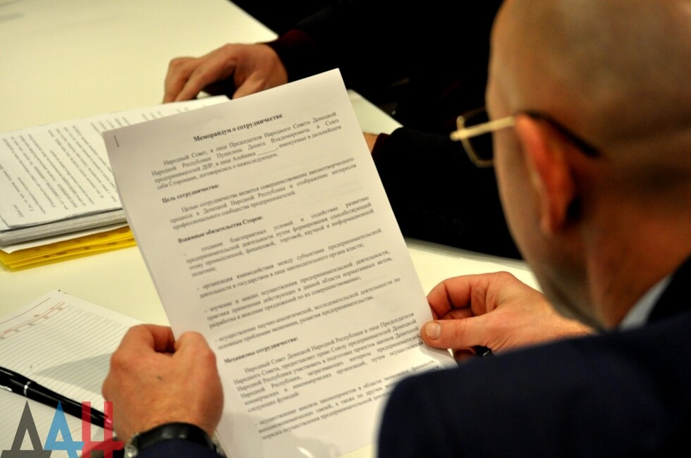 Донецк, 19 ноя – корр. ДАН. Народный Совет Донецкой Народной Республики и общественная организация «Союз предпринимателей ДНР» подписали сегодня соглашение о сотрудничестве.