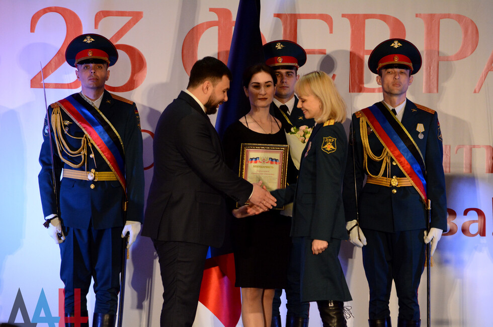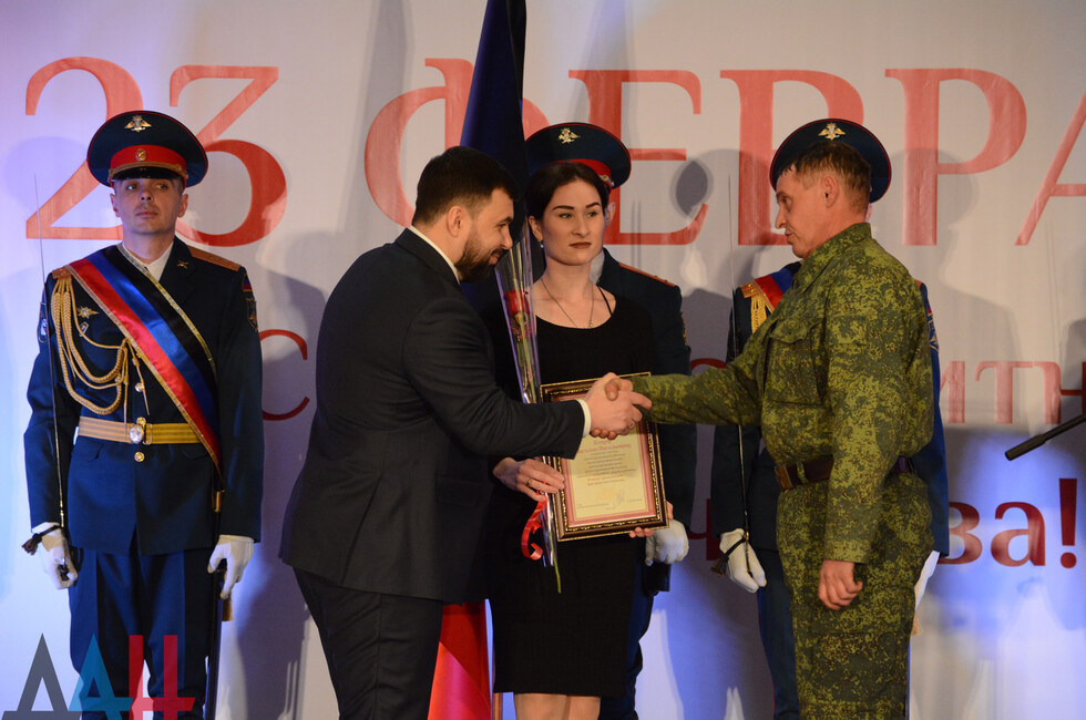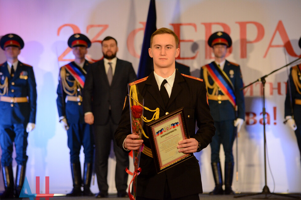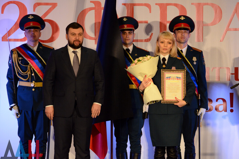 Лидер государства со сцены поздравил присутствующих с праздником, пожелал здоровья и мирного неба над головой. Затем он вручил один знак отличия "Георгиевский крест ДНР" 1-й степени и шесть - 4-й степени, а также 19 благодарностей.