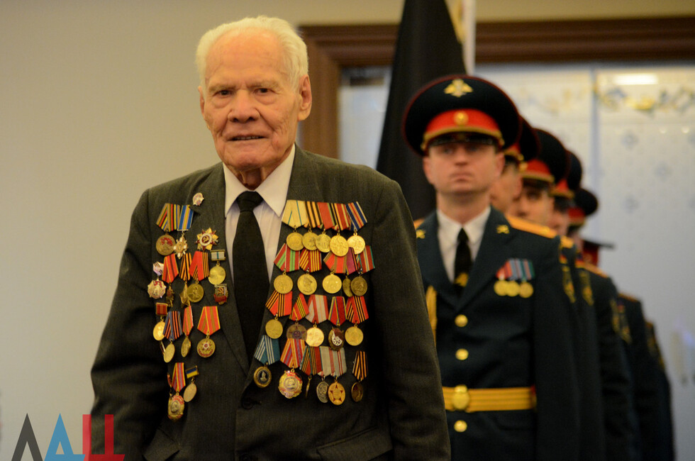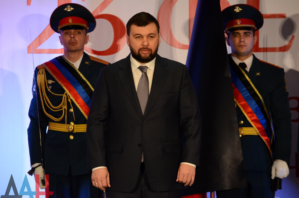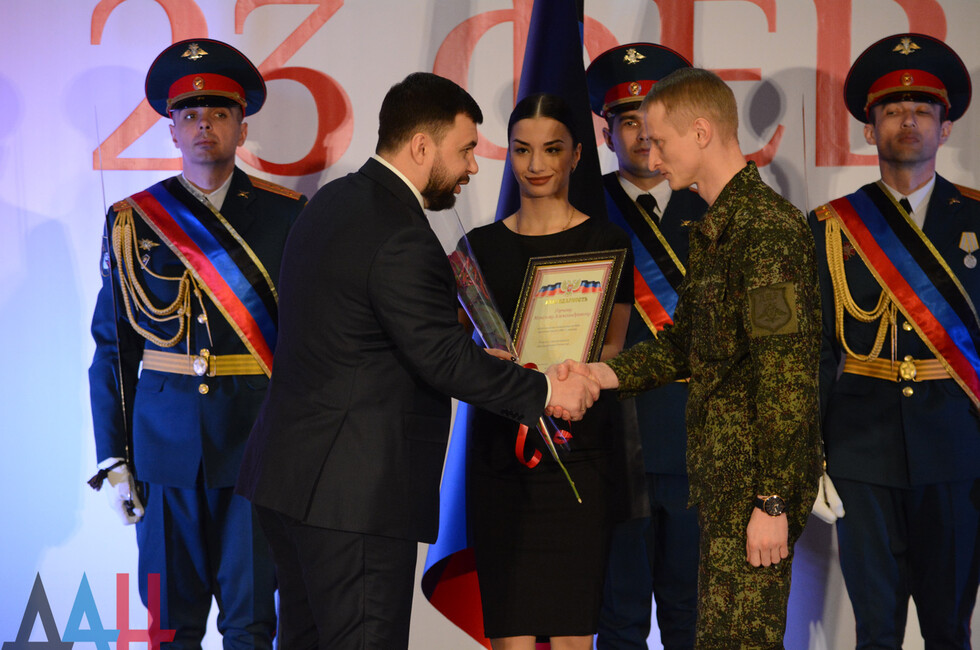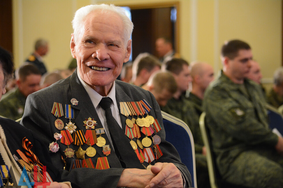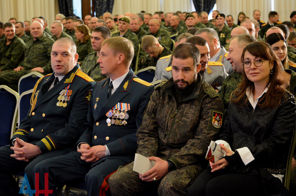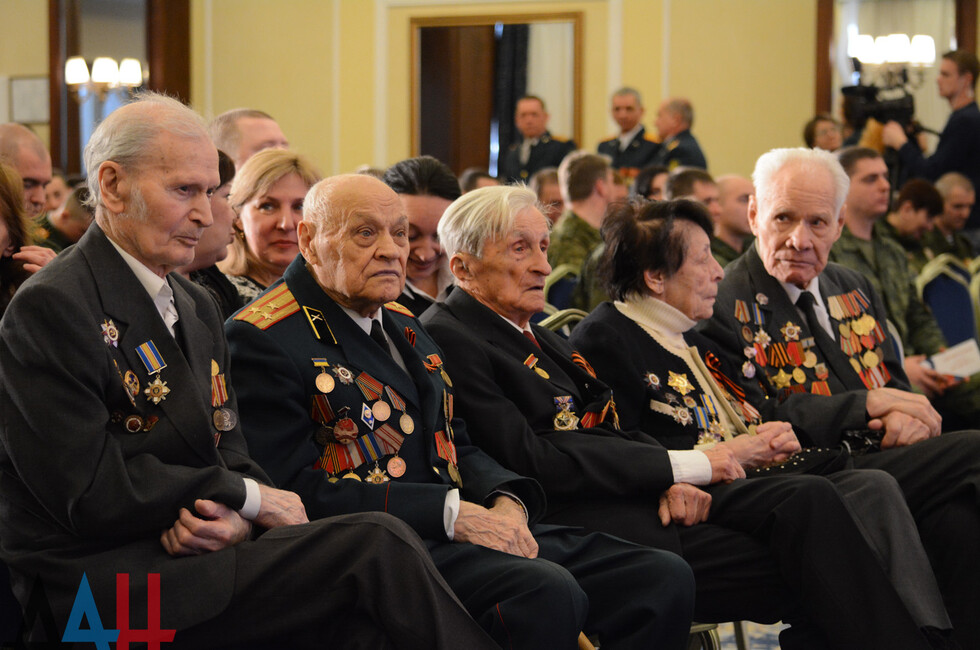 В зале присутствовали: Глава ДНР Денис Пушилин, представители Правительства, ветераны ВОВ, военнослужащие Республики.