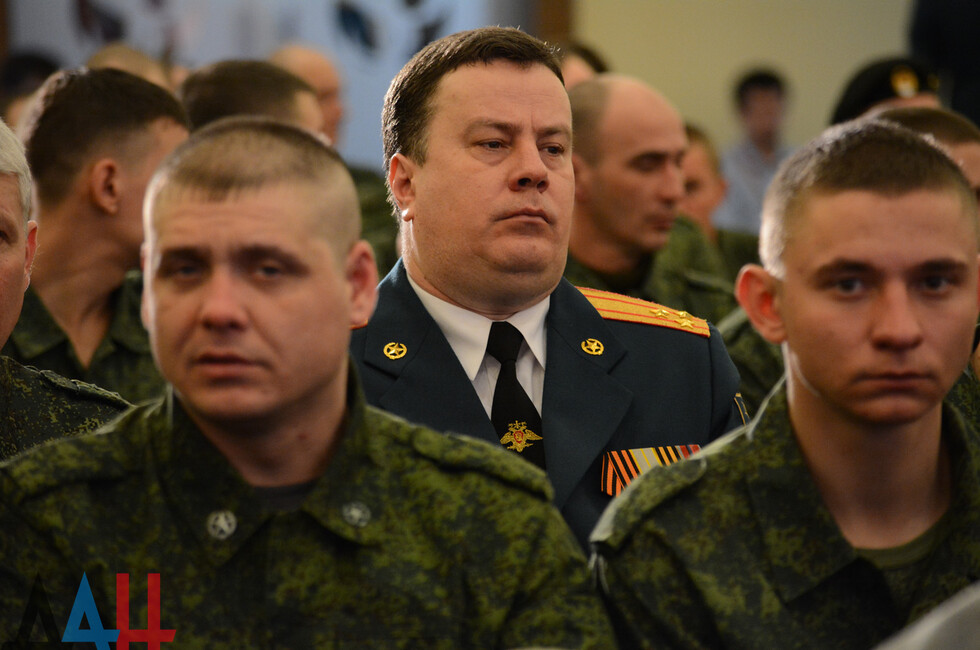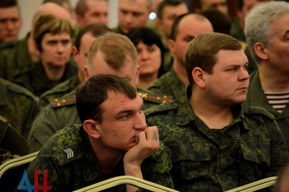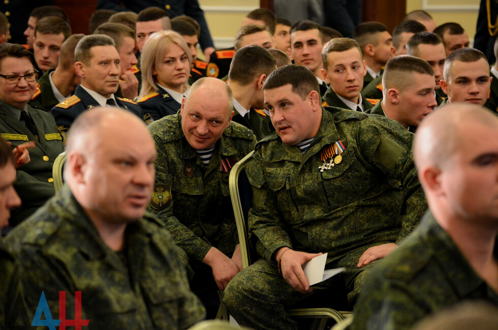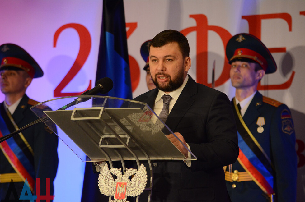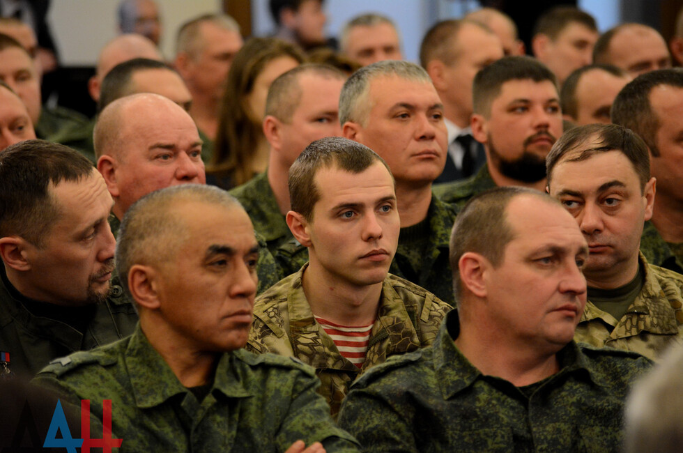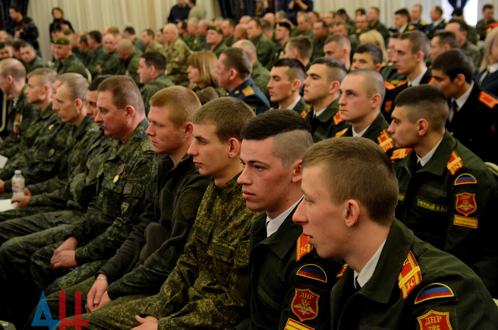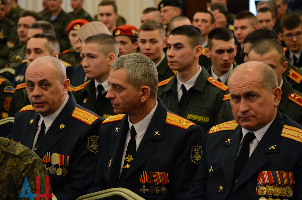 В зале присутствовали: Глава ДНР Денис Пушилин, представители Правительства, ветераны ВОВ, военнослужащие Республики.