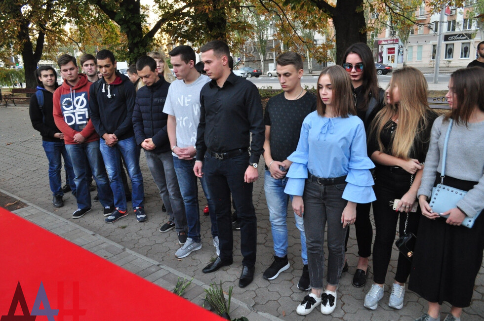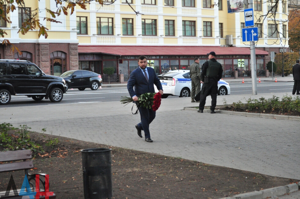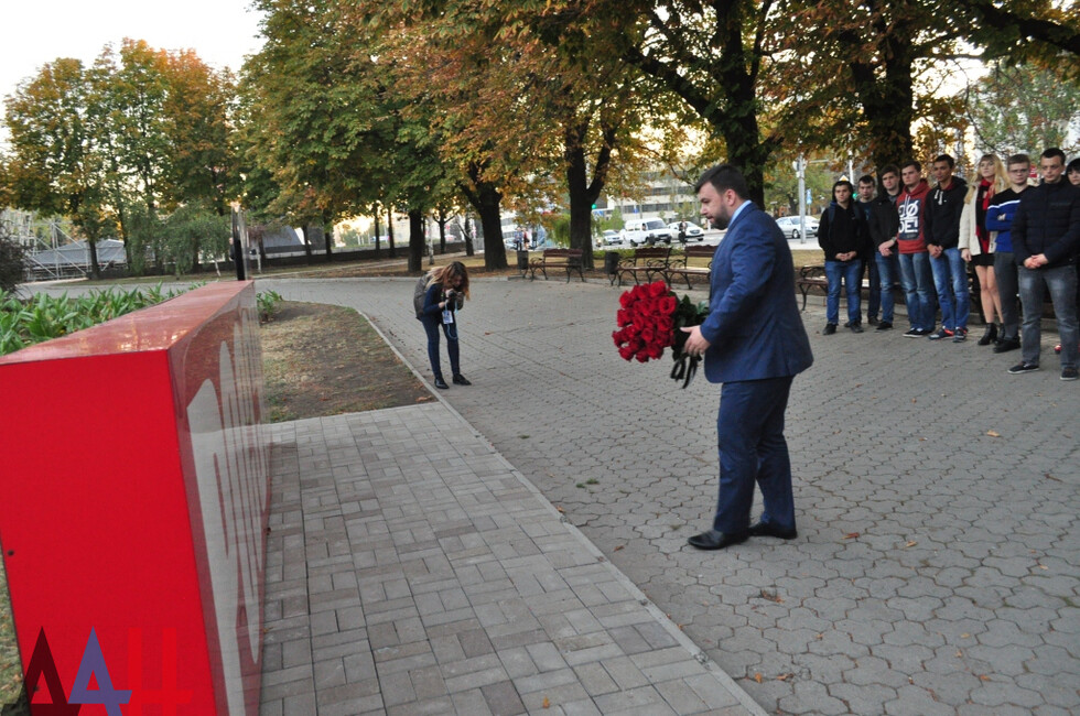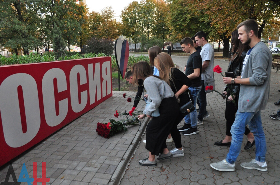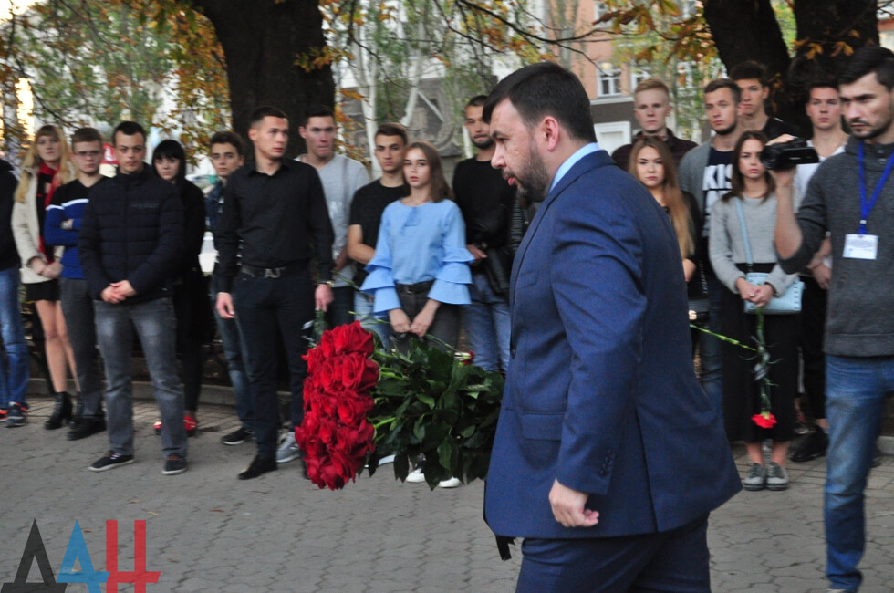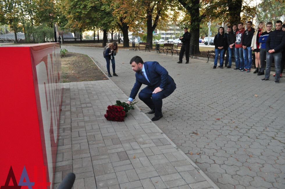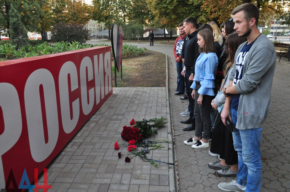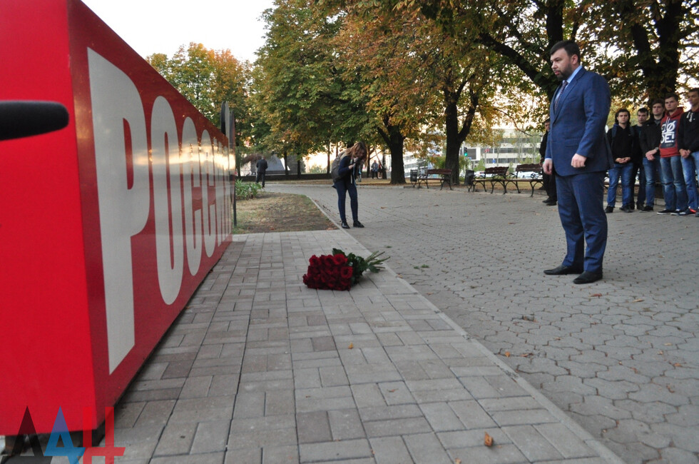Донецк, 17 окт – ДАН. Временно исполняющий обязанности Главы ДНР Денис Пушилин почтил память погибших в результате сегодняшнего взрыва в Керченском политехническом колледже, возложив цветы к знаку «Россия» в центре Донецка. Об этом сообщает корр. ДАН из столичного сквера «Первомайский».