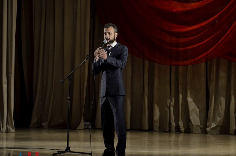 Церемония началась с исполнения государственного гимна. Затем пошли поздравления. Первым взял слово временно исполняющий обязанности Главы ДНР Денис Пушилин.