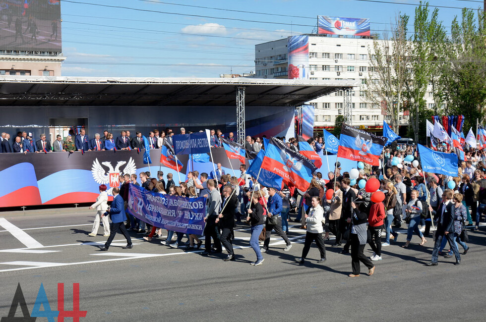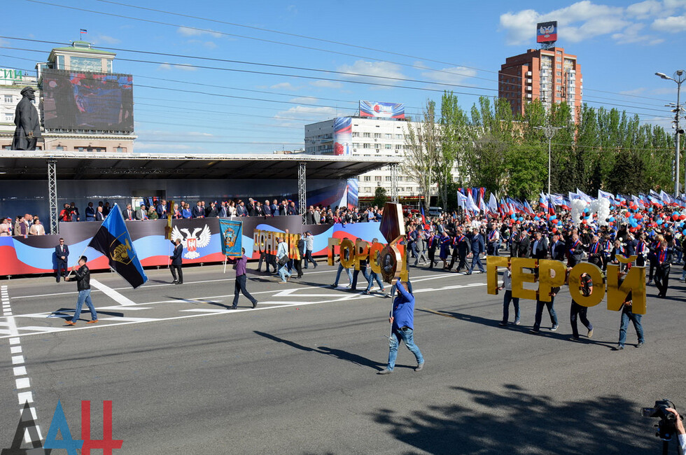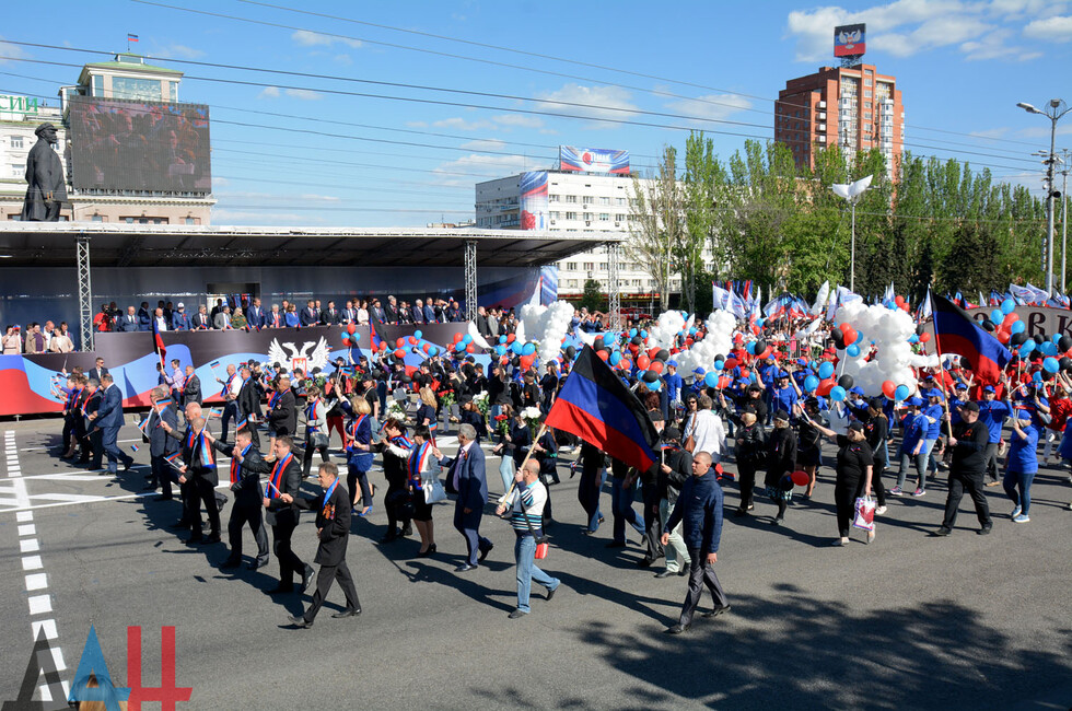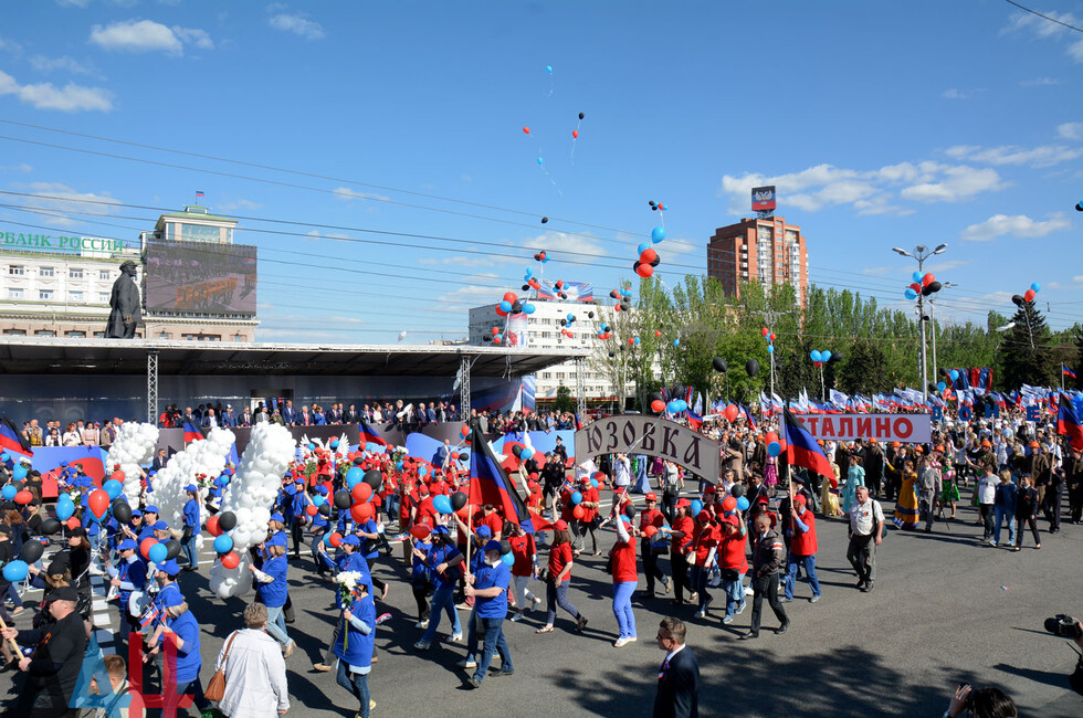 Колонна выдвинулась со стороны площади Ленина и следует по главной улице города – Артема. На площади установлена специальная трибуна. Демонстрантов приветствует Глава ДНР Александр Захарченко, члены Правительства, а также представители делегаций из России, Южной Осетии, Абхазии и ЛНР, которые прибыли в Донецк на праздничные мероприятия.