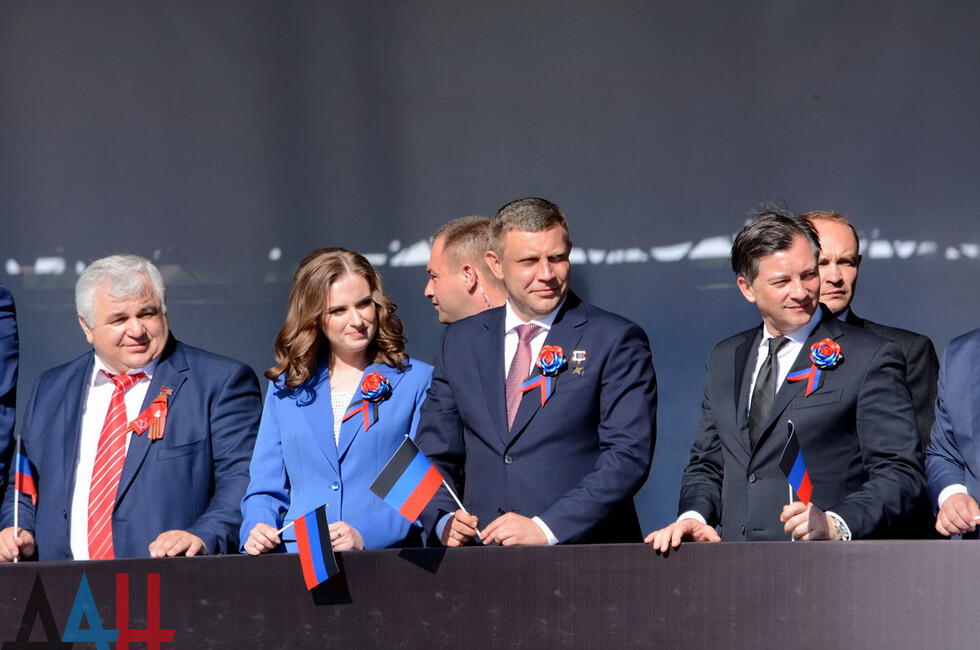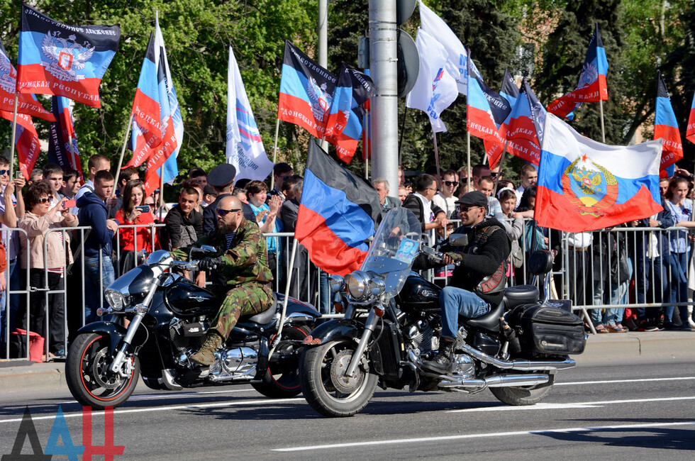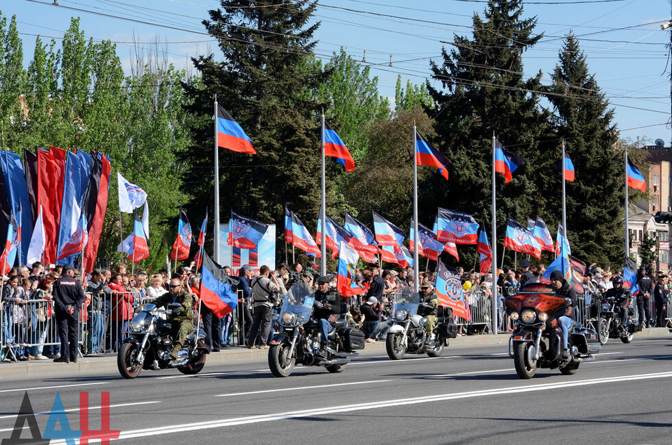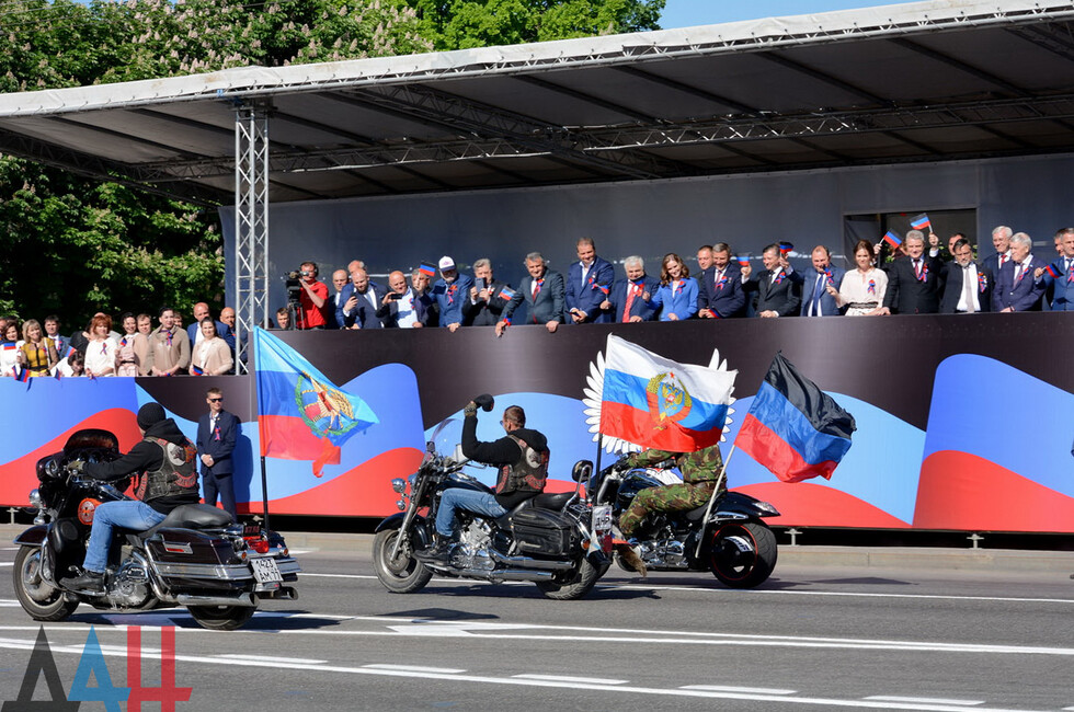 Марш возглавил байкеры клуба «Ночные волки». За ними идут председатель Народного Совета Денис Пушилин и депутаты парламента. Далее в колонне - делегации городов и районов ДНР, активисты общественного движения «Донецкая Республика» и организации «Молодая Республика». Участники шествия несут флаги Донецкой Народной Республики, цветы и транспаранты.