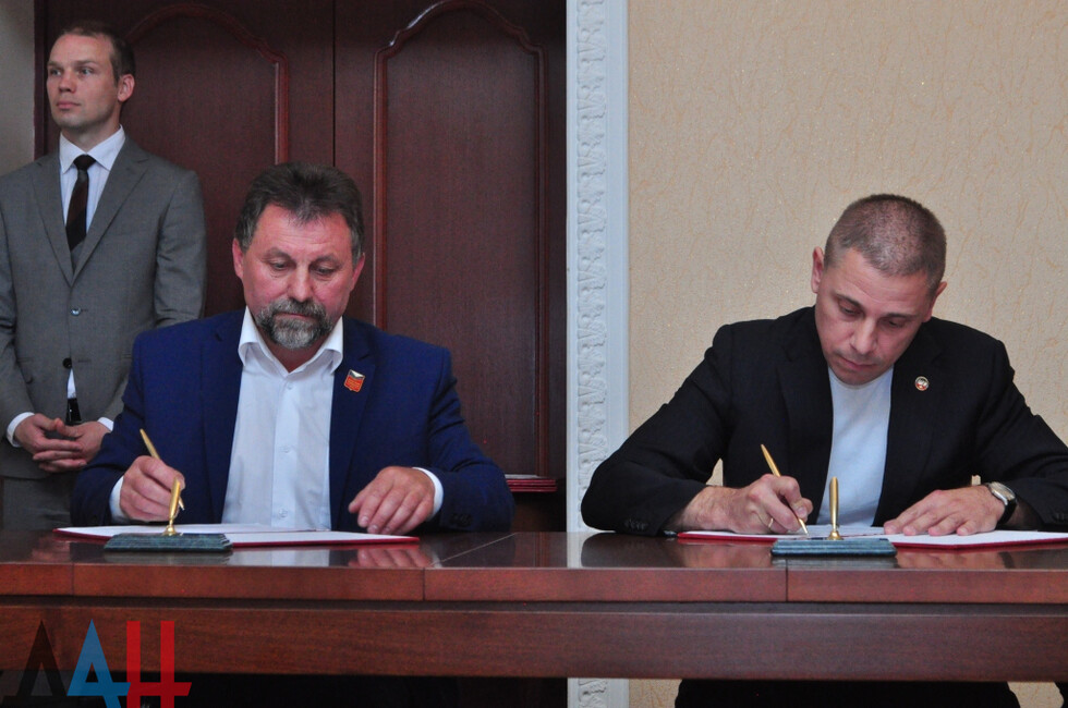 Договор подписали главы администрация Александр Спинул и Александр Ярыгин. На встрече присутствовал врио губернатора Курской области Роман Старовойт, участники делегации из Донбасса, а также представители Белоруссии, Молдавии, ФРГ и других государств.