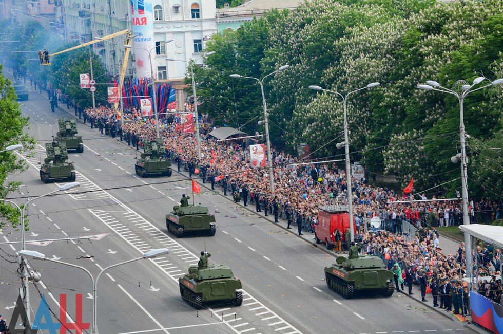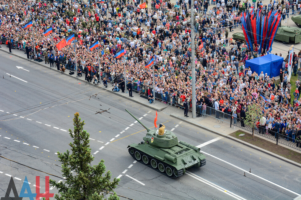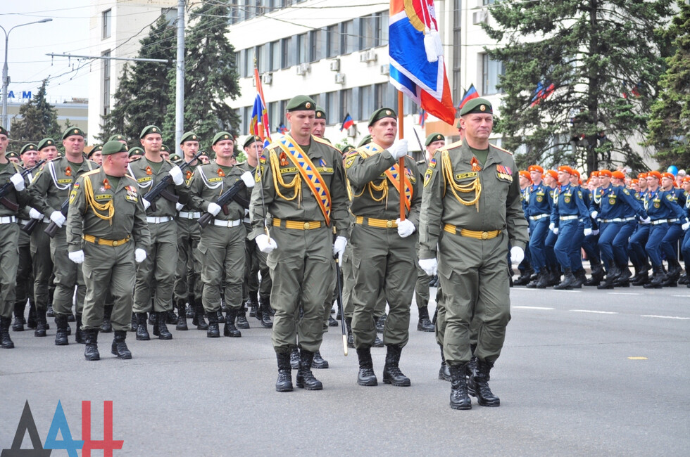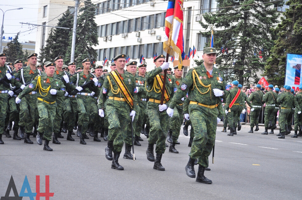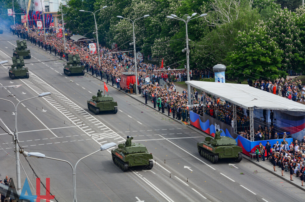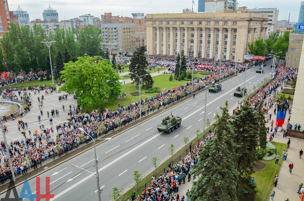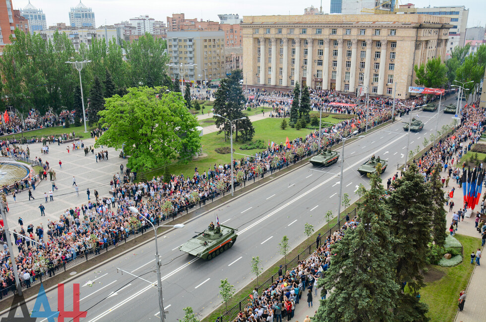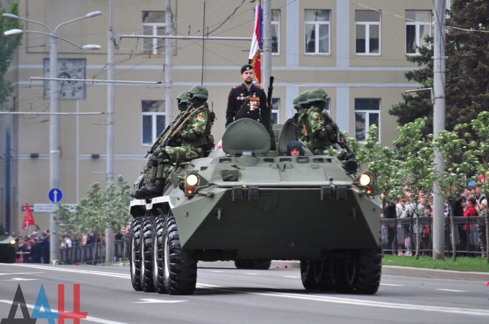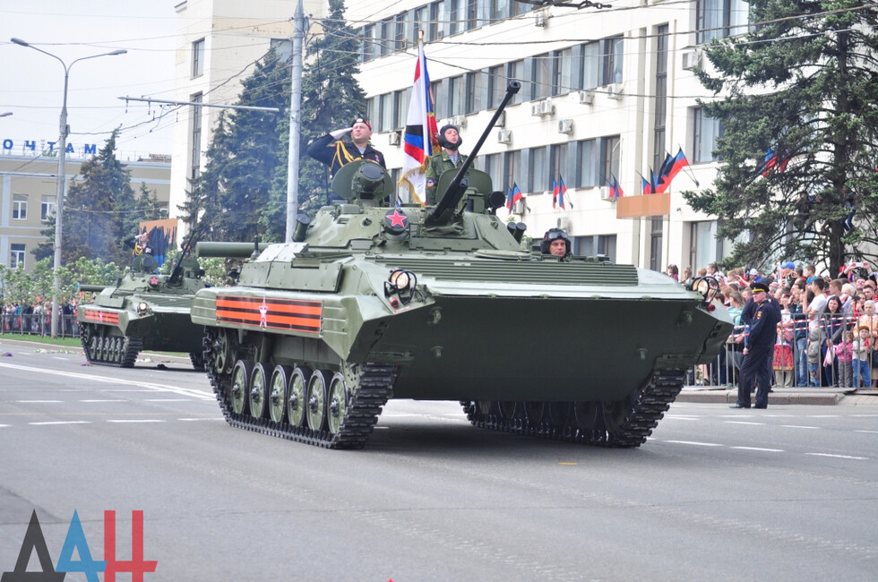 Демонстрацию современных образцов открыла колонна БТР-80 батальона «Спарта», командиром которого был Герой ДНР Арсен Павлов (Моторола). За ней проследовали БМП, танки Т-64 и Т-72, ЗРК «Стрела-10», самоходки «Гвоздика», «Грады», полковые минометы, противотанковые пушки «Рапира», гаубицы Д-30 и «Мста-Б». В конце колоны - советская спаренная зенитная установка ЗУ-23-2 в составе двух крупнокалиберных пулеметов.