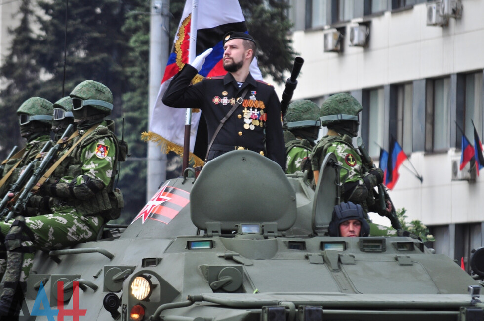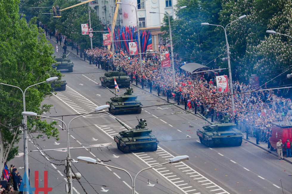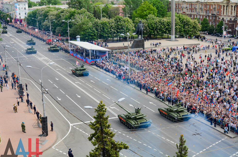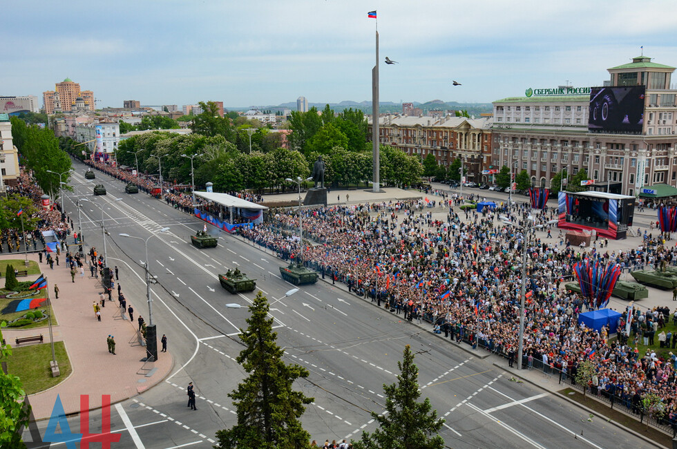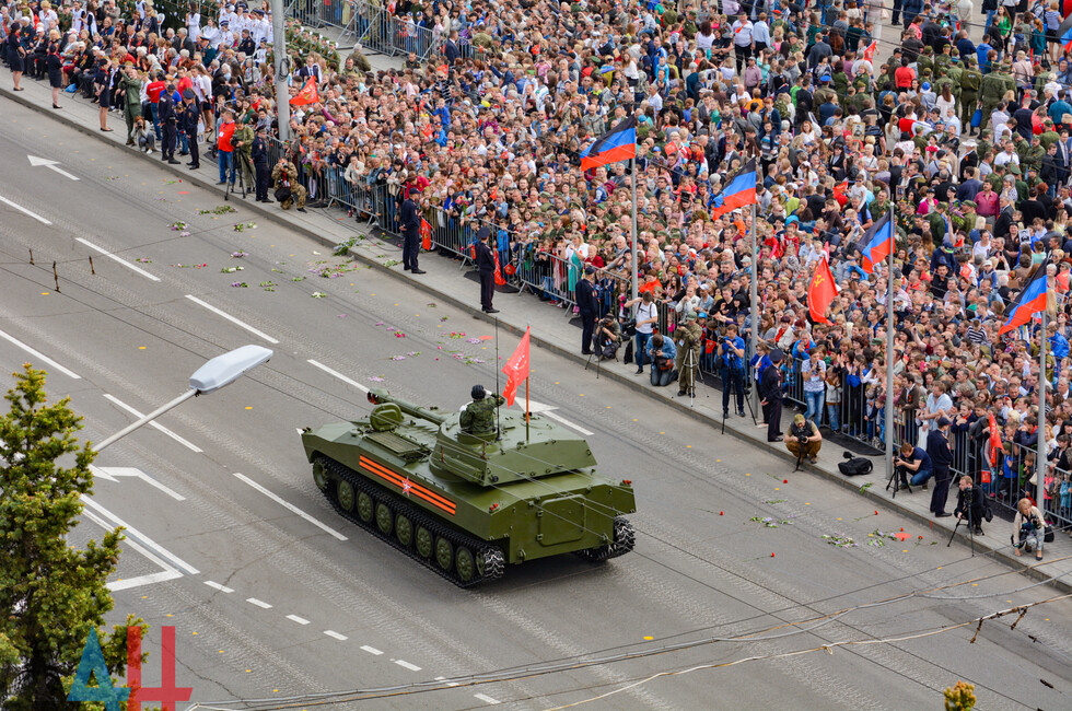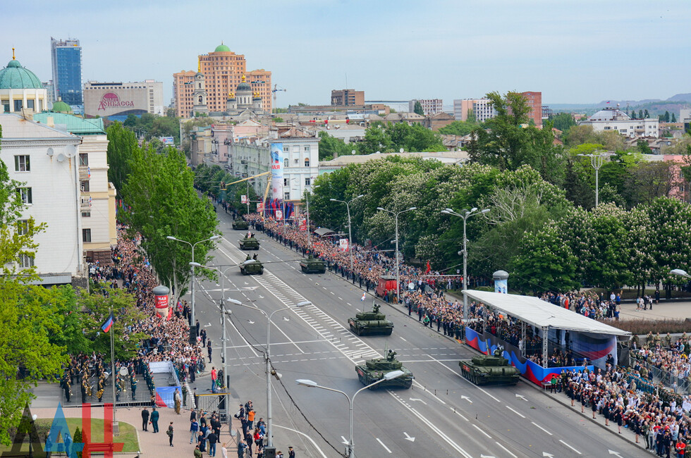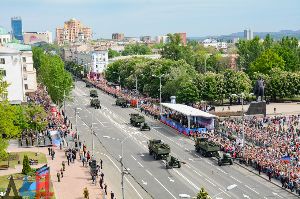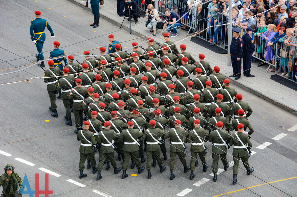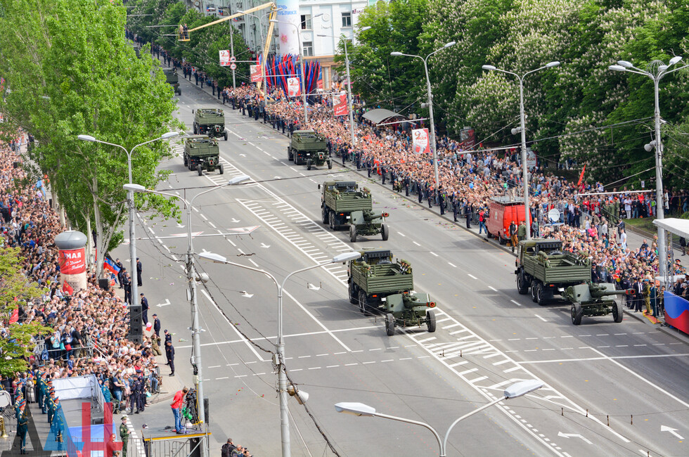 Демонстрацию современных образцов открыла колонна БТР-80 батальона «Спарта», командиром которого был Герой ДНР Арсен Павлов (Моторола). За ней проследовали БМП, танки Т-64 и Т-72, ЗРК «Стрела-10», самоходки «Гвоздика», «Грады», полковые минометы, противотанковые пушки «Рапира», гаубицы Д-30 и «Мста-Б». В конце колоны - советская спаренная зенитная установка ЗУ-23-2 в составе двух крупнокалиберных пулеметов.