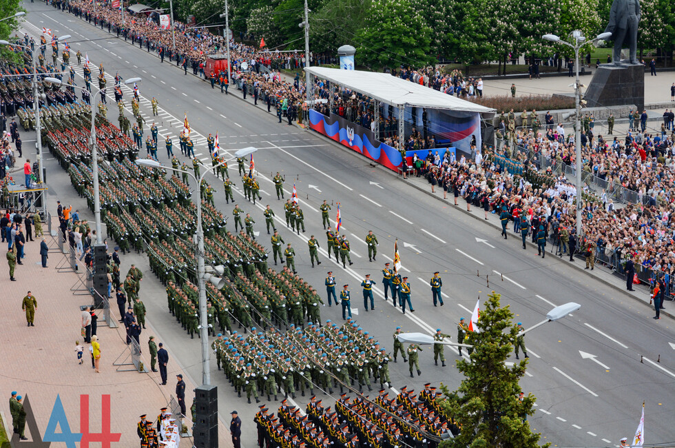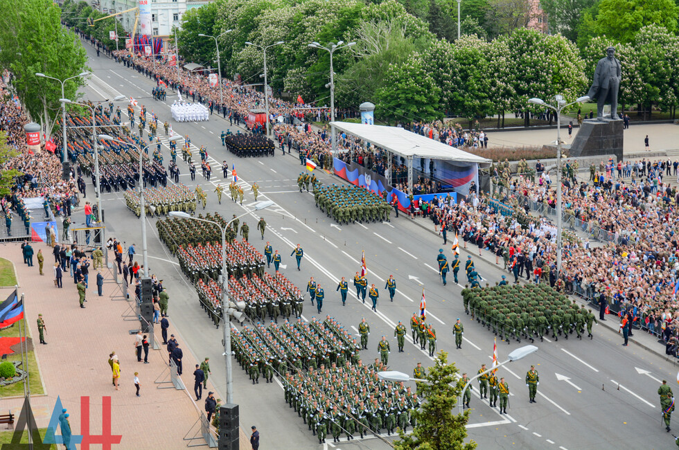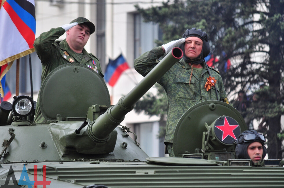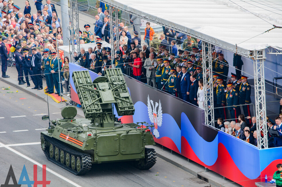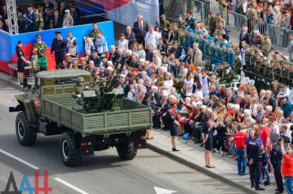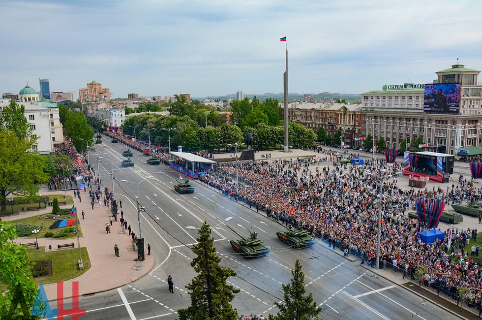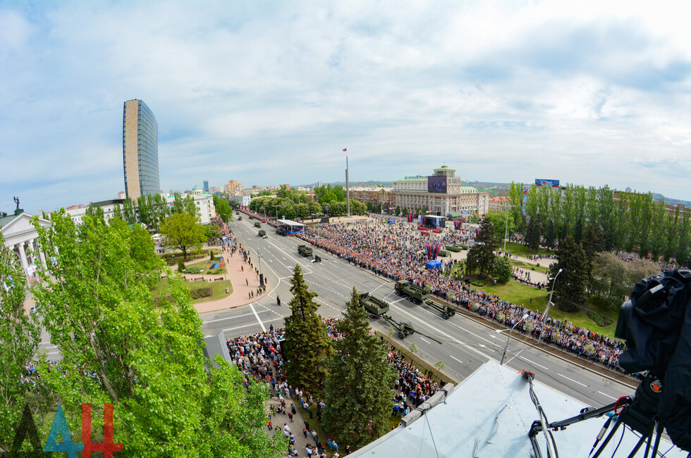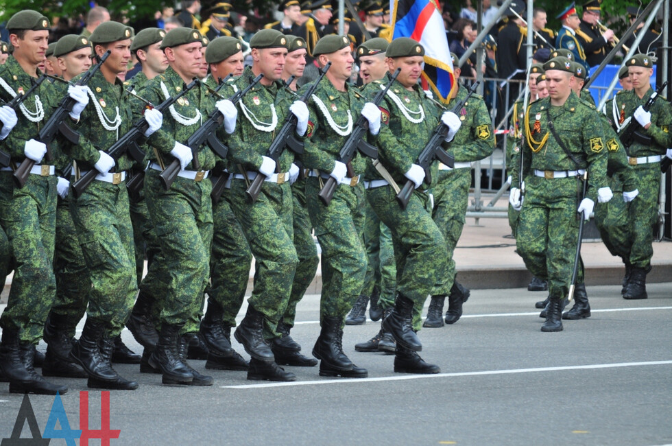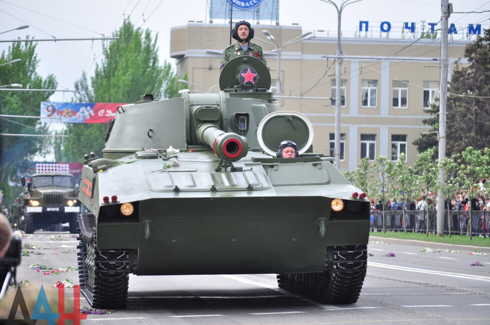 Демонстрацию современных образцов открыла колонна БТР-80 батальона «Спарта», командиром которого был Герой ДНР Арсен Павлов (Моторола). За ней проследовали БМП, танки Т-64 и Т-72, ЗРК «Стрела-10», самоходки «Гвоздика», «Грады», полковые минометы, противотанковые пушки «Рапира», гаубицы Д-30 и «Мста-Б». В конце колоны - советская спаренная зенитная установка ЗУ-23-2 в составе двух крупнокалиберных пулеметов.