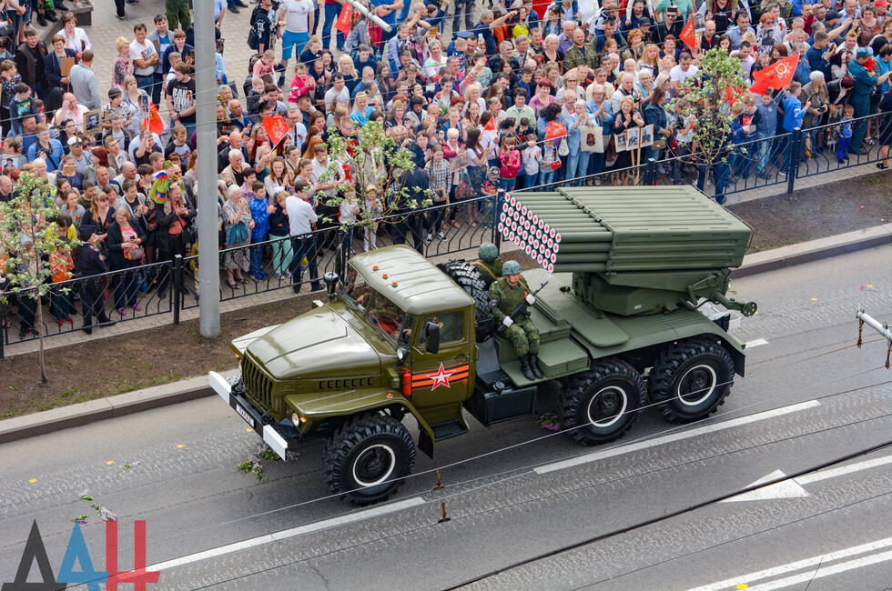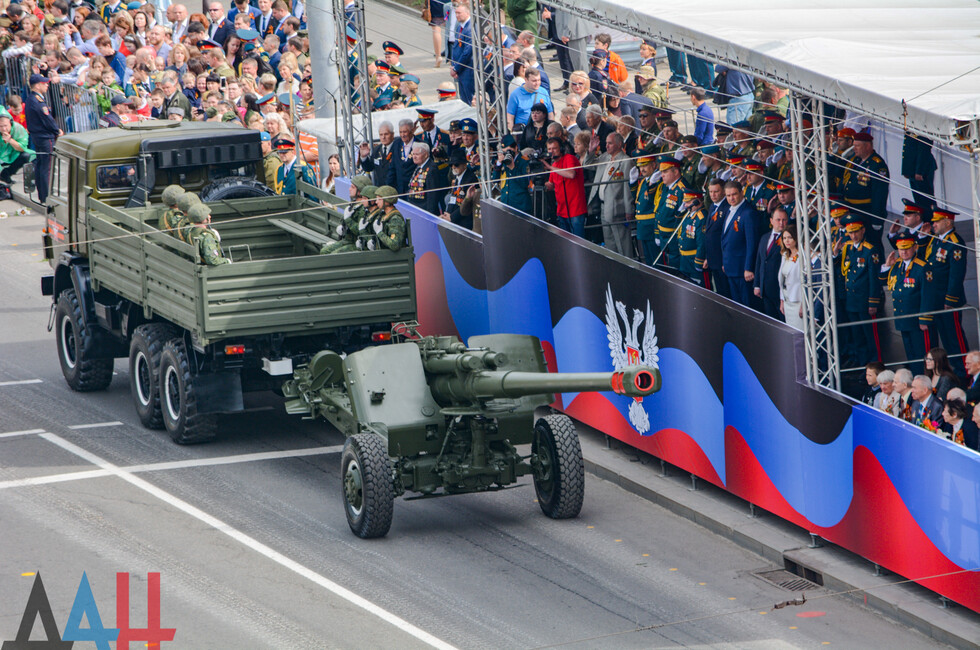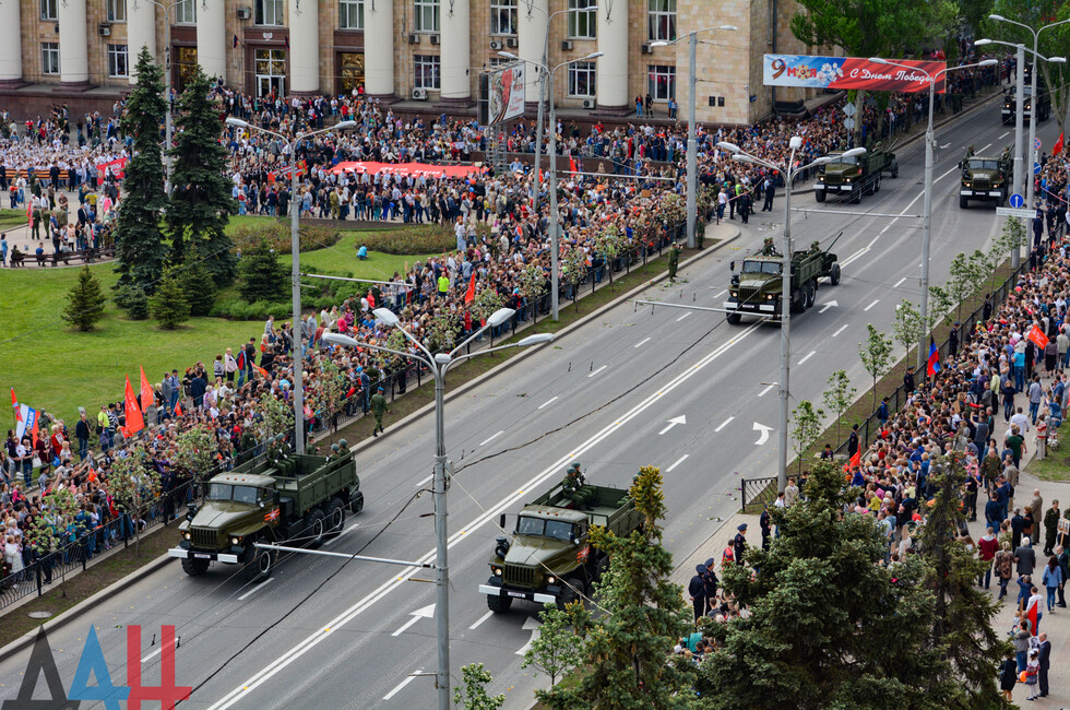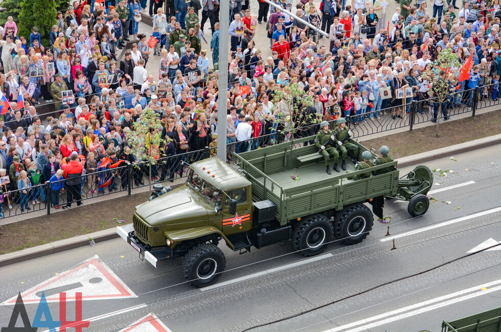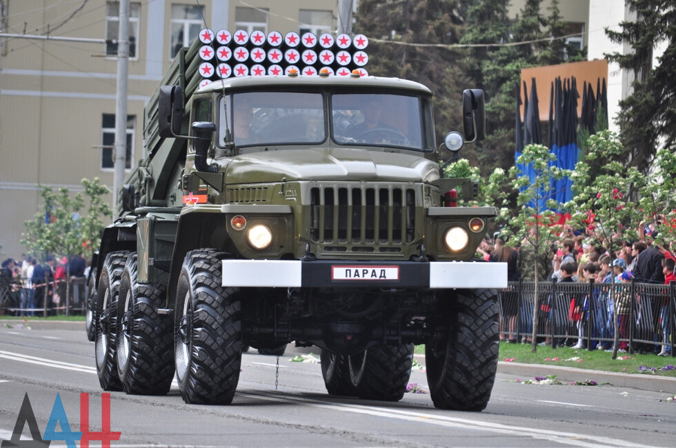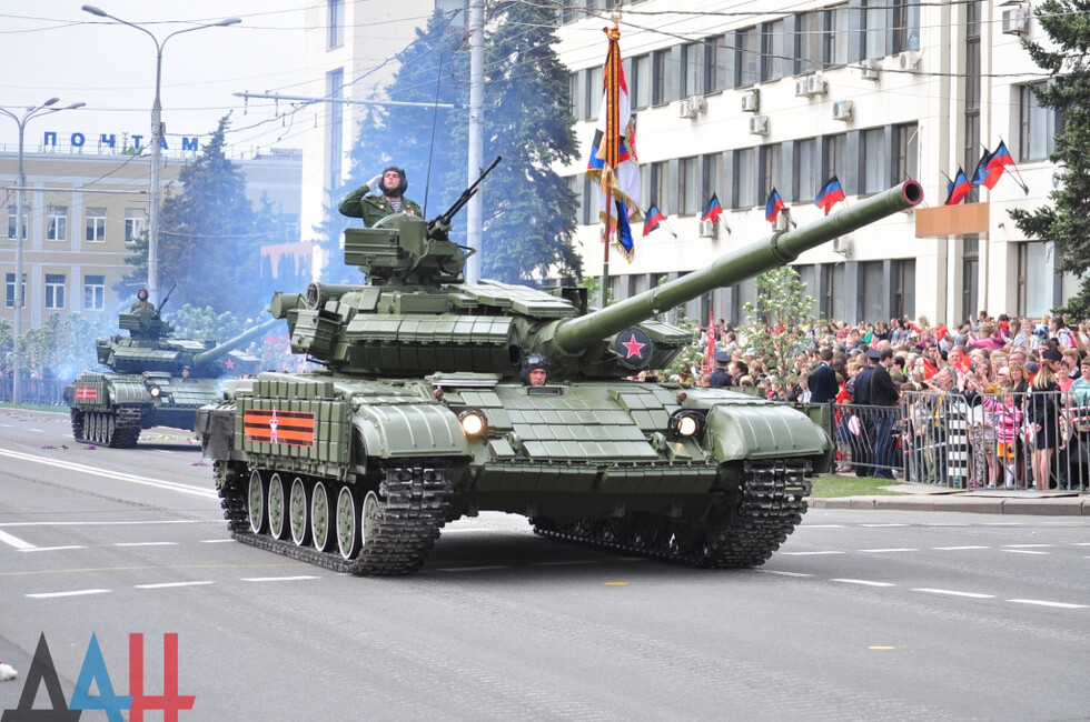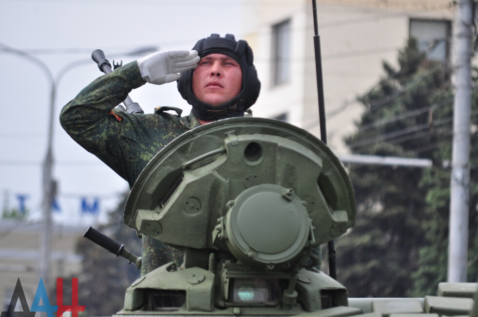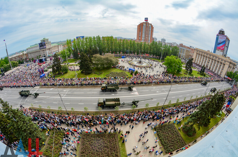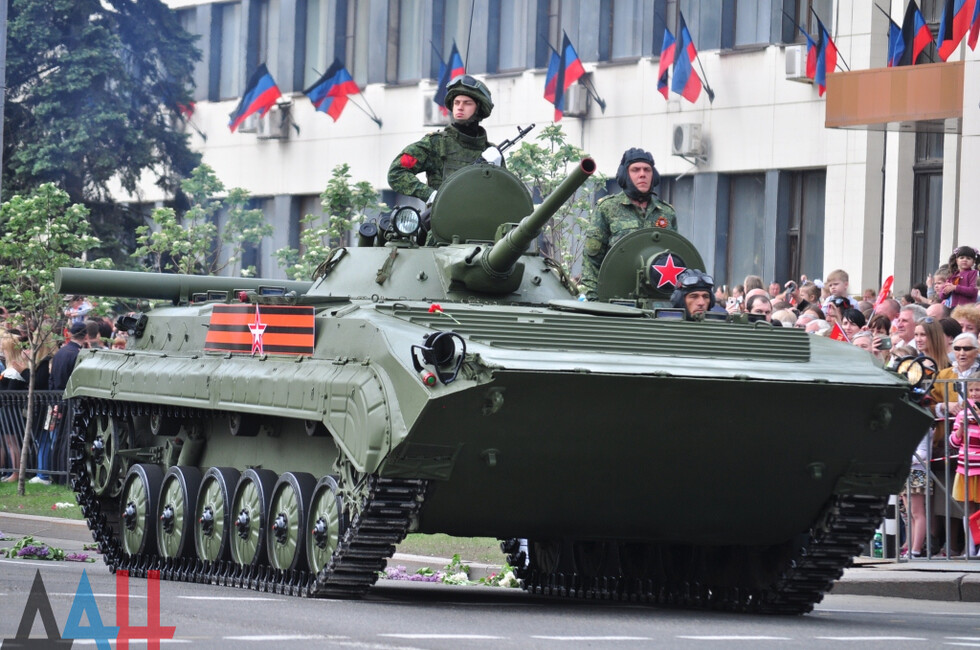 Демонстрацию современных образцов открыла колонна БТР-80 батальона «Спарта», командиром которого был Герой ДНР Арсен Павлов (Моторола). За ней проследовали БМП, танки Т-64 и Т-72, ЗРК «Стрела-10», самоходки «Гвоздика», «Грады», полковые минометы, противотанковые пушки «Рапира», гаубицы Д-30 и «Мста-Б». В конце колоны - советская спаренная зенитная установка ЗУ-23-2 в составе двух крупнокалиберных пулеметов.