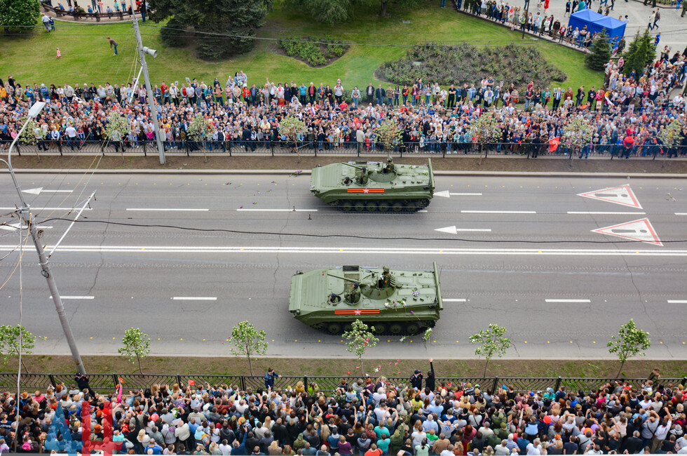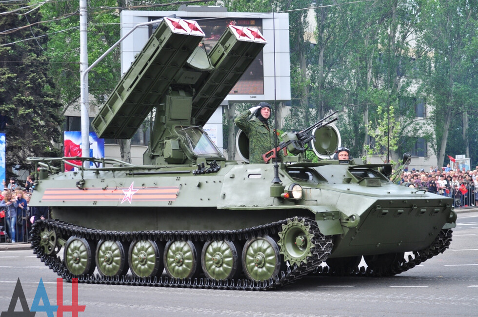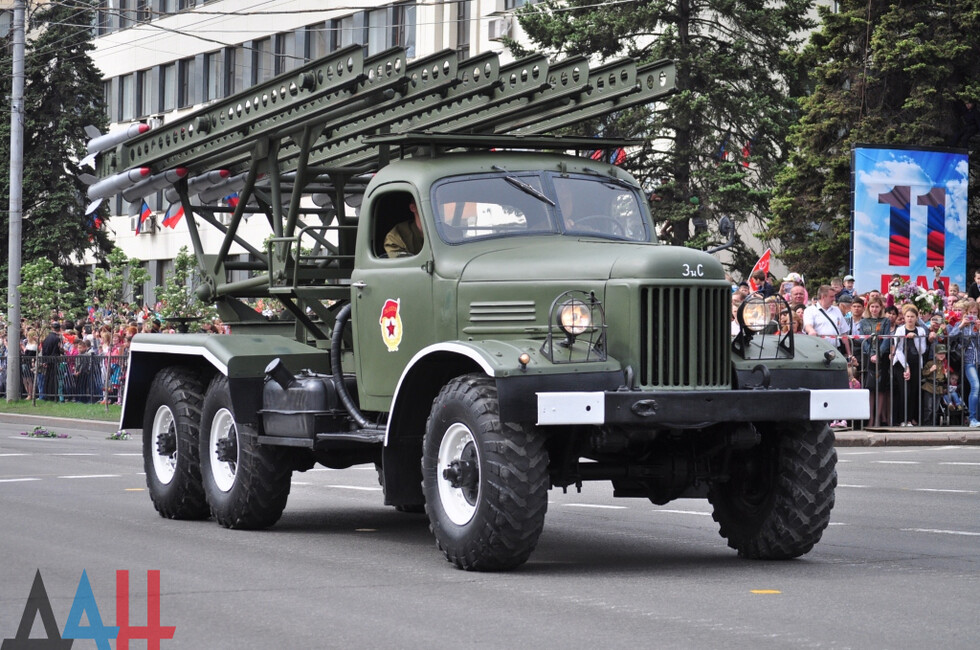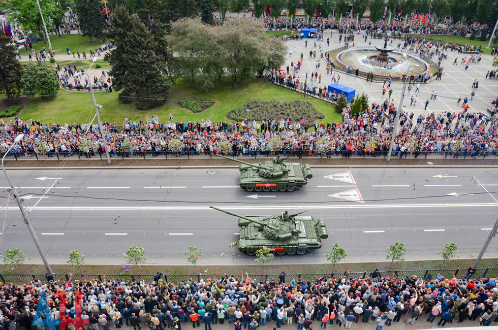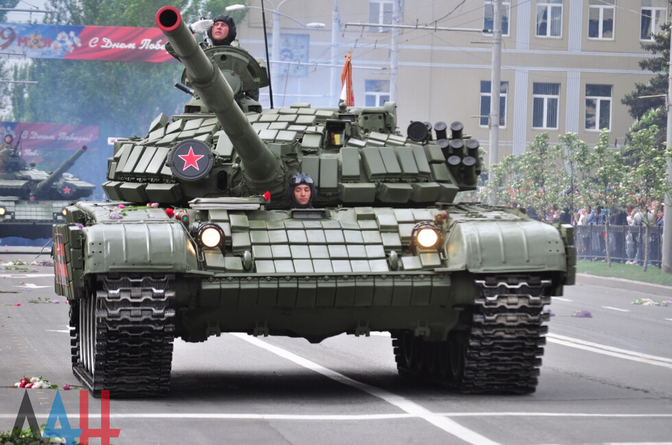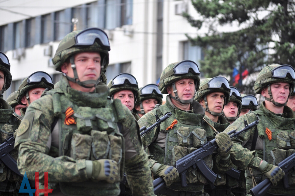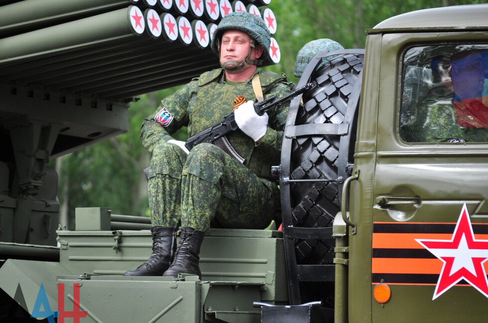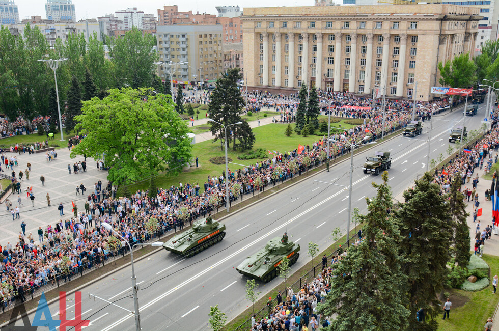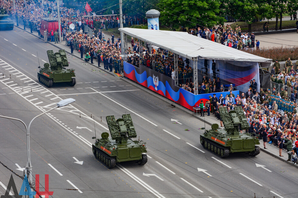 Демонстрацию современных образцов открыла колонна БТР-80 батальона «Спарта», командиром которого был Герой ДНР Арсен Павлов (Моторола). За ней проследовали БМП, танки Т-64 и Т-72, ЗРК «Стрела-10», самоходки «Гвоздика», «Грады», полковые минометы, противотанковые пушки «Рапира», гаубицы Д-30 и «Мста-Б». В конце колоны - советская спаренная зенитная установка ЗУ-23-2 в составе двух крупнокалиберных пулеметов.