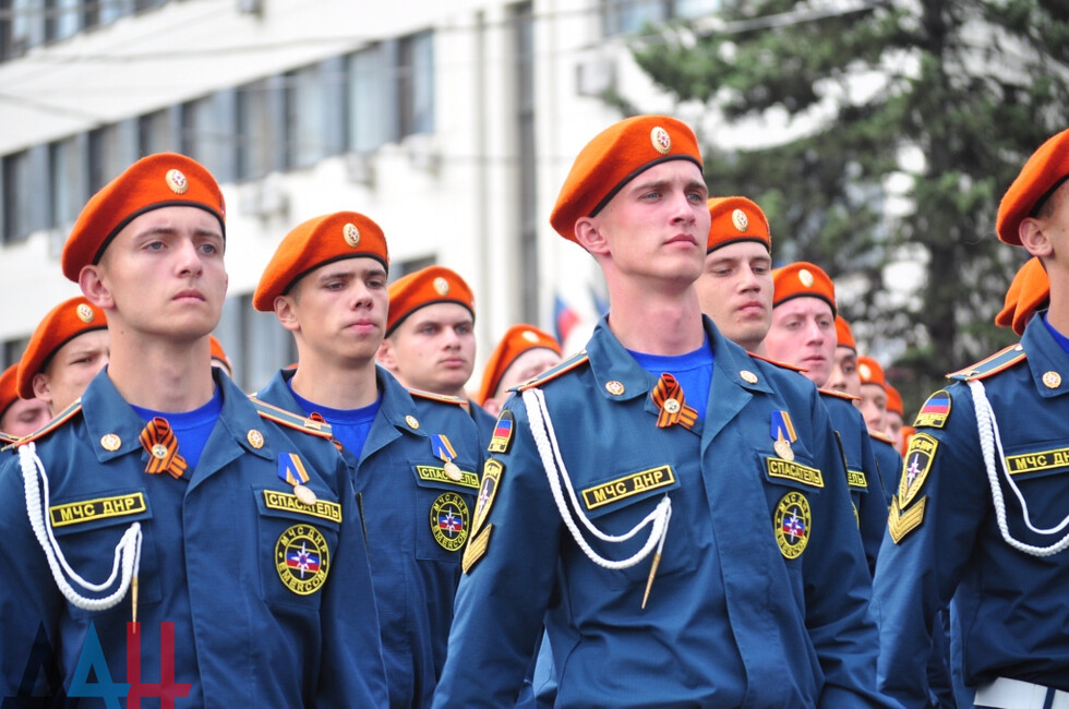 Свое почетное место в пешей колонне заняли и силы МЧС. Четыре "коробки", чеканя шаг, прошли перед многотысячной публикой. Особой гордостью Парада стал расчет женщин спасательного ведомства. За ними проследовал отряд «Легион», обеспечивающий безопасность спасательных операций вблизи передовой. Впервые представили МЧС на Параде и курсанты Академии гражданской защиты.
