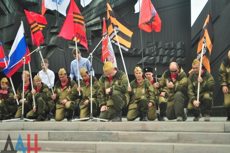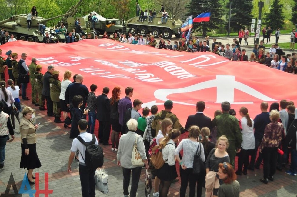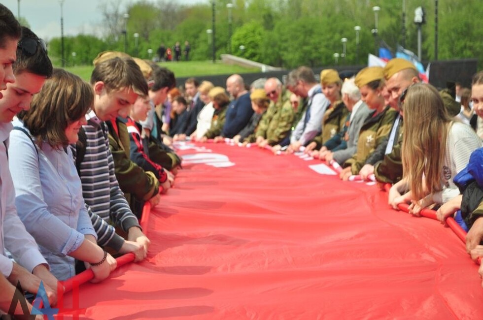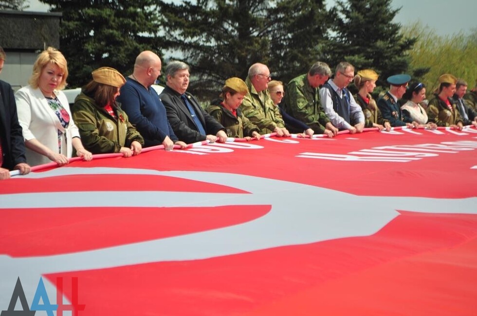 Донецк, 19 апр – корр. ДАН. Участники международного патриотического автомарша «Звезда нашей Великой Победы» сегодня доставили в Донецк двухсотметровую копию Знамени Победы. Развернули полотнище у монумента «Твоим освободителям, Донбасс» в центре столицы ДНР, где также прошел митинг, посвященный предстоящей 71-й годовщине Победы в Великой Отечественной войне.
