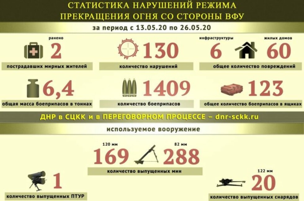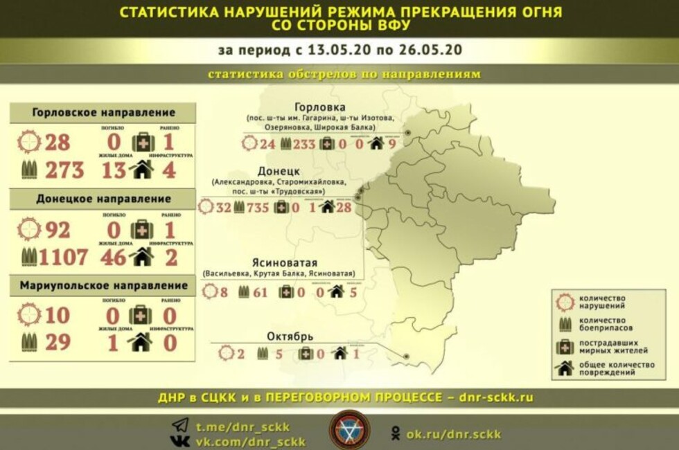 По данным СЦКК, с 13 по 26 мая в результате обстрелов со стороны войск Киева двое гражданских лиц в ДНР получили ранения, разрушено три и повреждено 57 домостроений, а также шесть объектов инфраструктуры. Наиболее напряженная ситуация сложилась в окрестностях Горловки, на юге Республики, в пригородах Донецка и в районе Докучаевска.