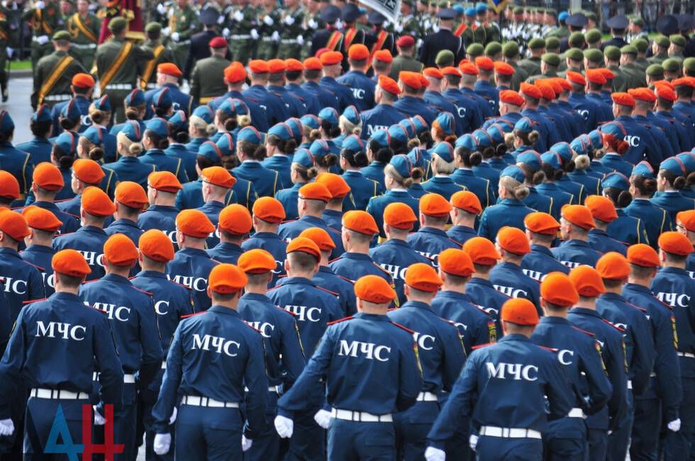 Почетное место в пешей колонне заняли и парадные расчеты МЧС. Вместе с мужчинами, чеканя шаг, прошли и женщины спасательного ведомства. За ними проследовали курсанты Академии гражданской защиты.