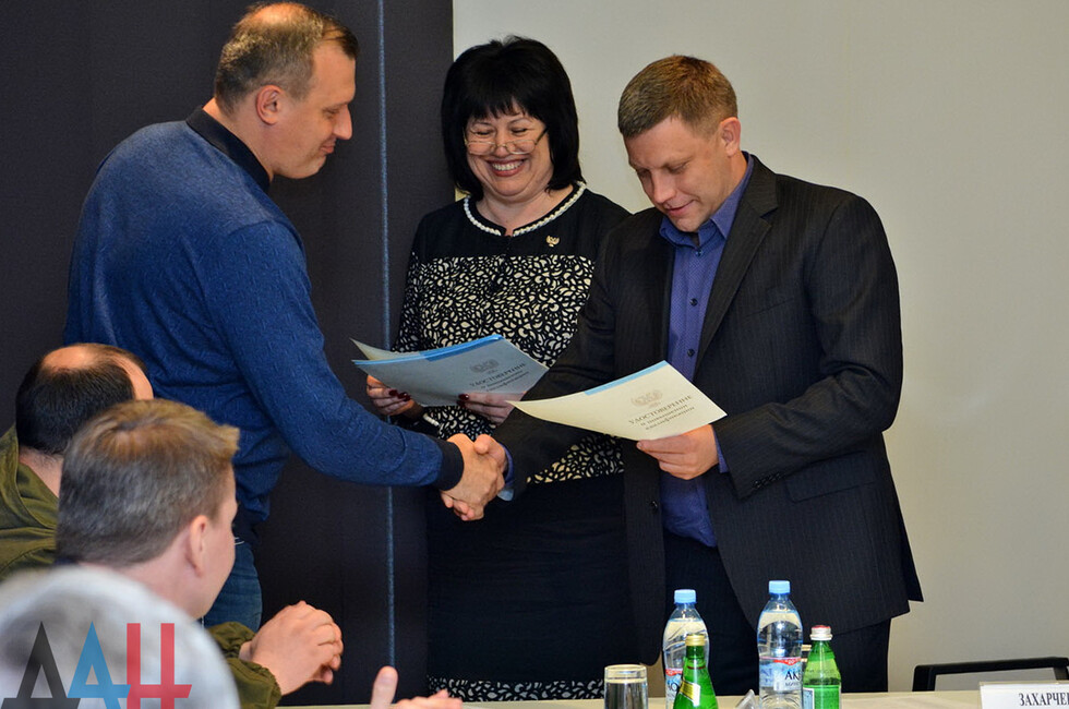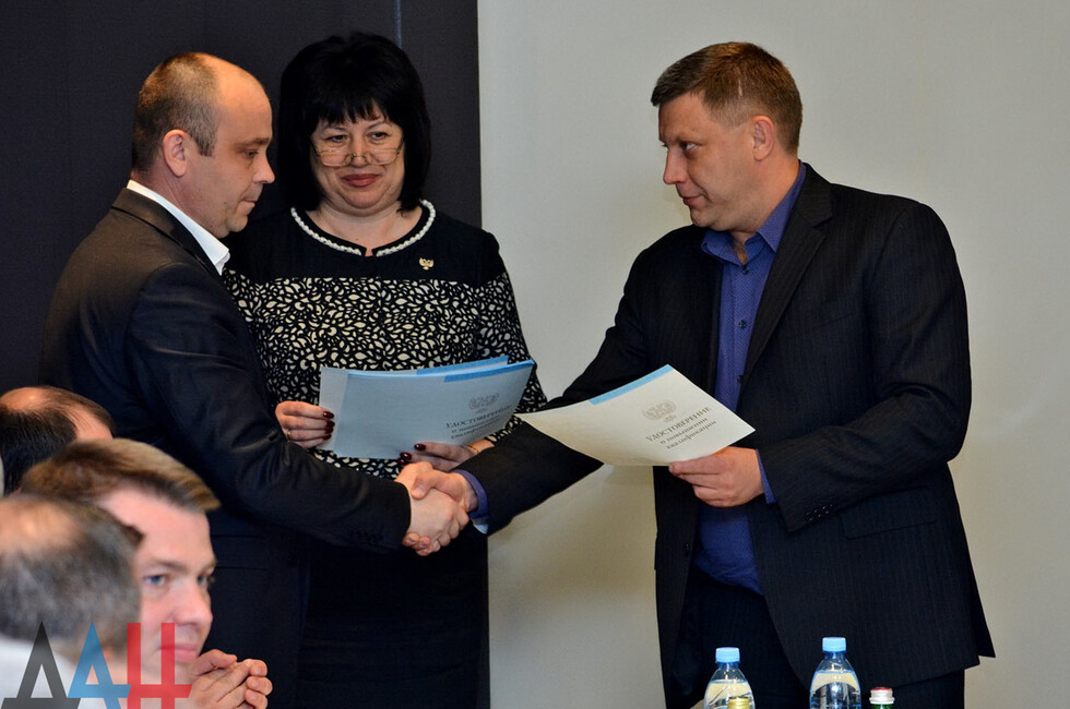 Удостоверения из рук Захарченко получили руководители администраций 18 городов и районов Донецкой Народной Республики. В частности, документ вручили и.о. мэру столицы ДНР Алексею Кулемзину, Макеевки - Валерию Ляховцу, Горловки - Ивану Приходько, Докучаевску - Александру Качанову, Ясиноватой - Олегу Моргуну и другим. Все они прошли месячное обучение в Донецкой академии управления и государственной службы при Главе ДНР при Центре дополнительного профессионального образования.