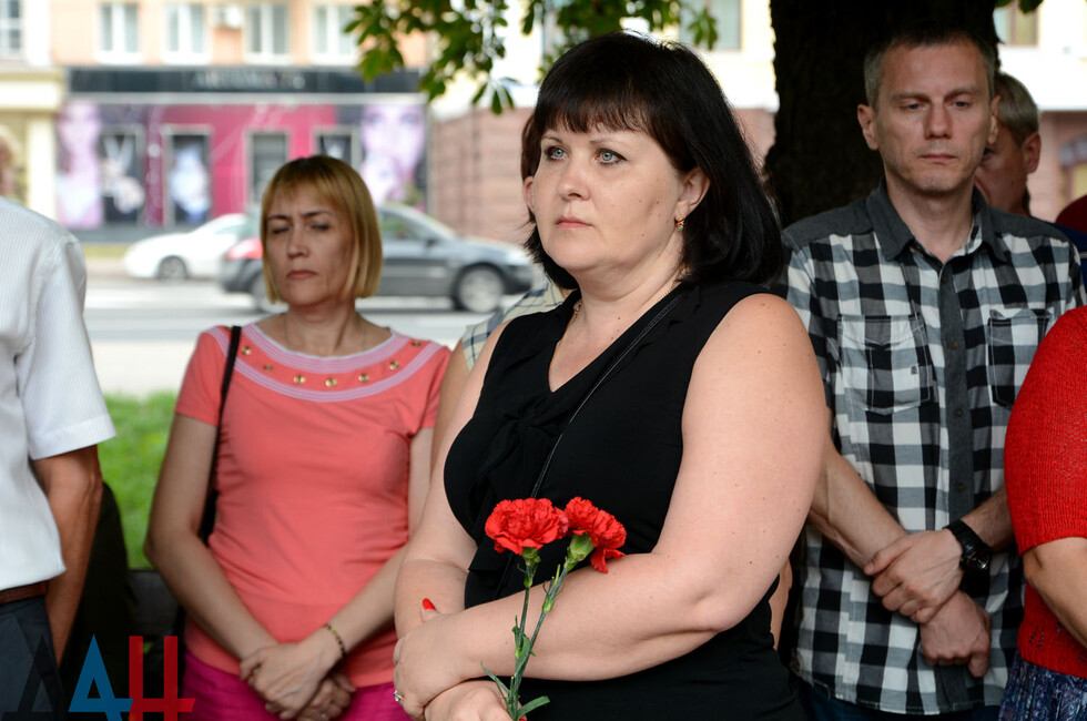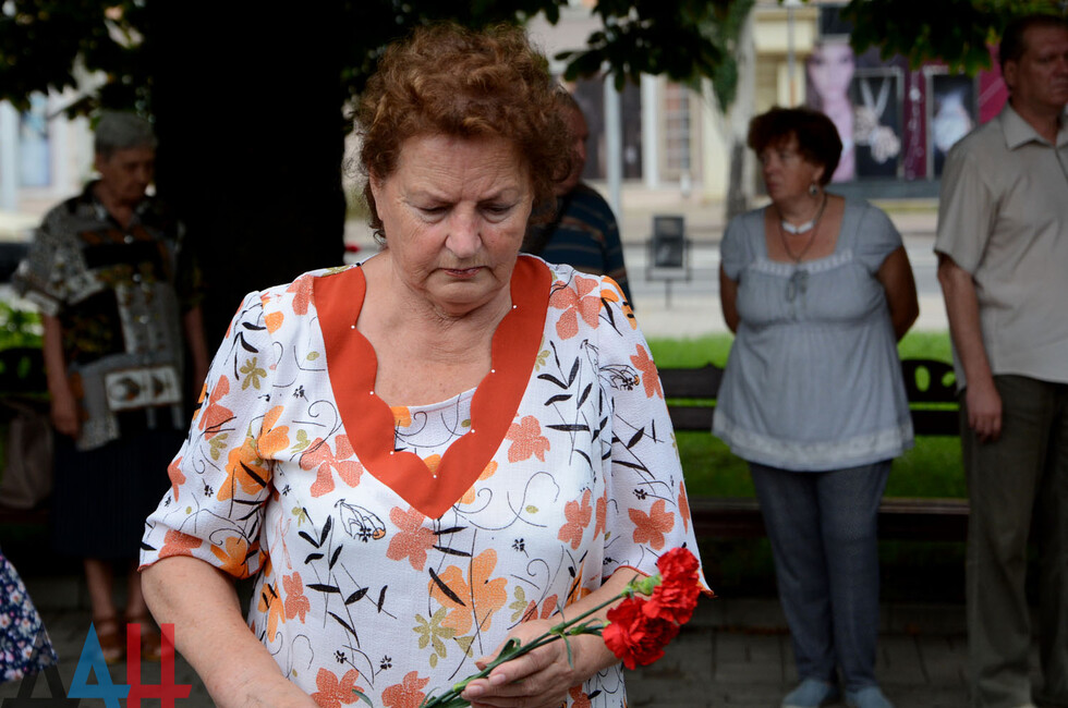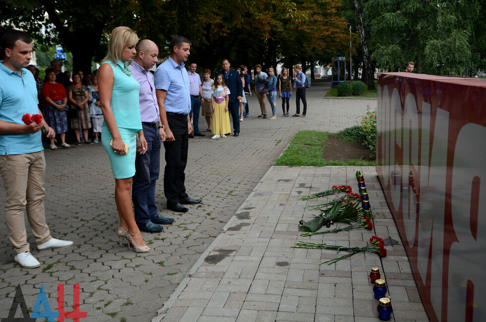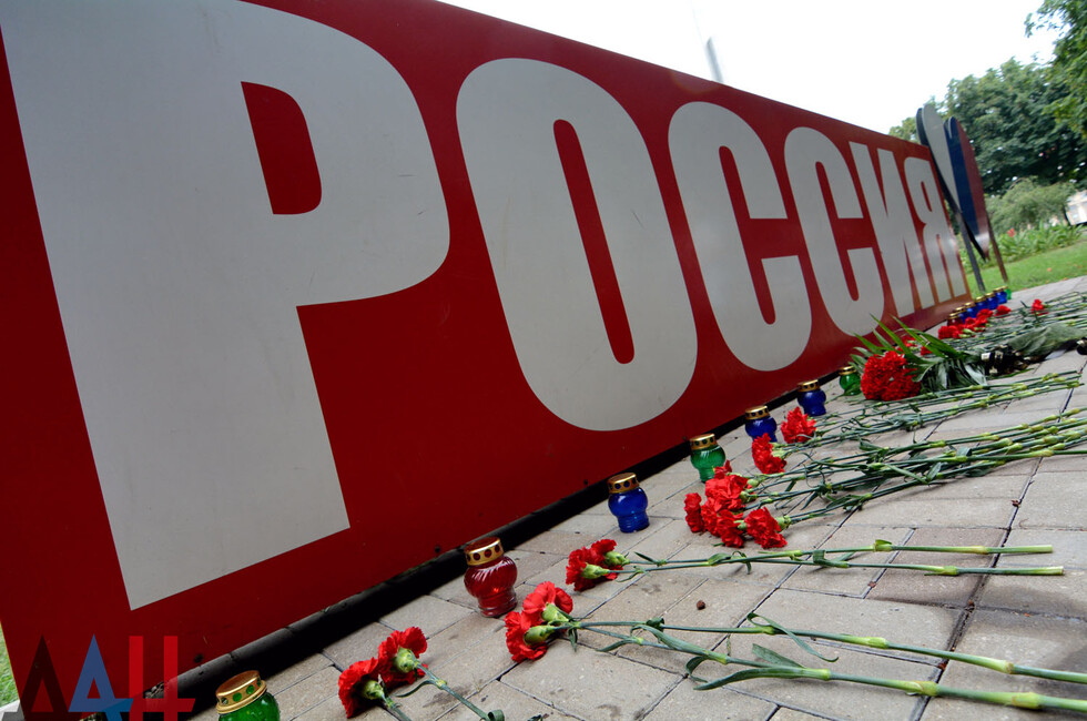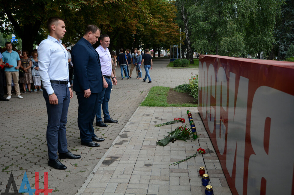 Мероприятие состоялось у арт-объекта «Россия» в районе площади Ленина в центре Донецка. Почтить память погибших пришли: руководитель Центрального исполкома общественного движения «Донецкая Республика» Алексей Муратов, общественники и жители города.
