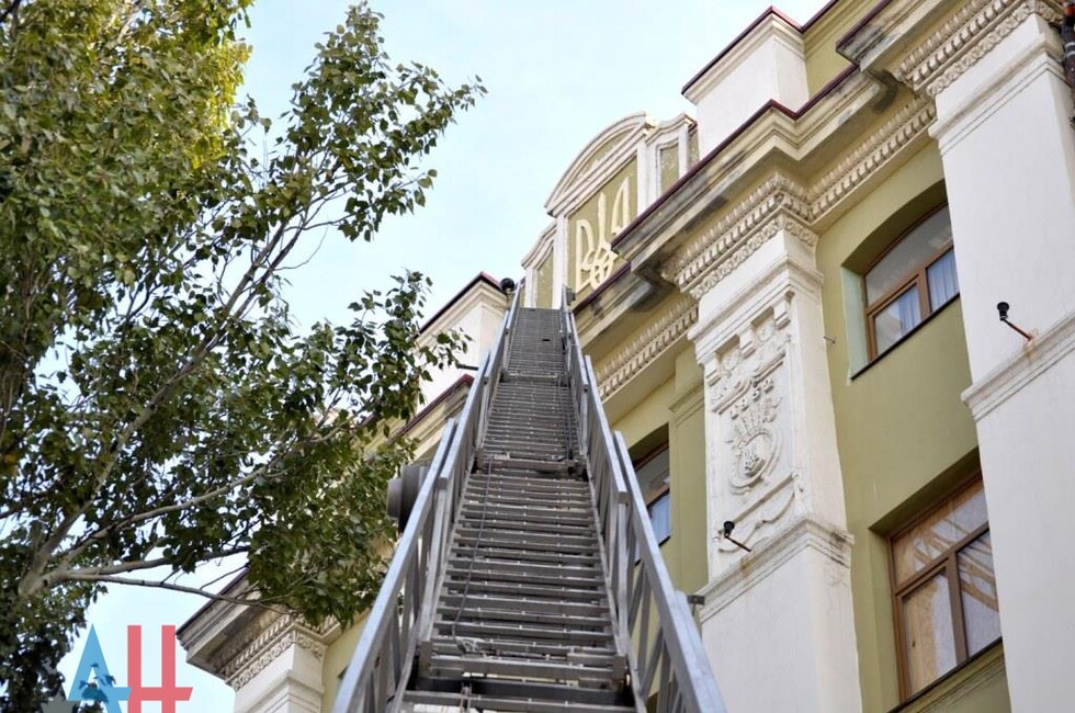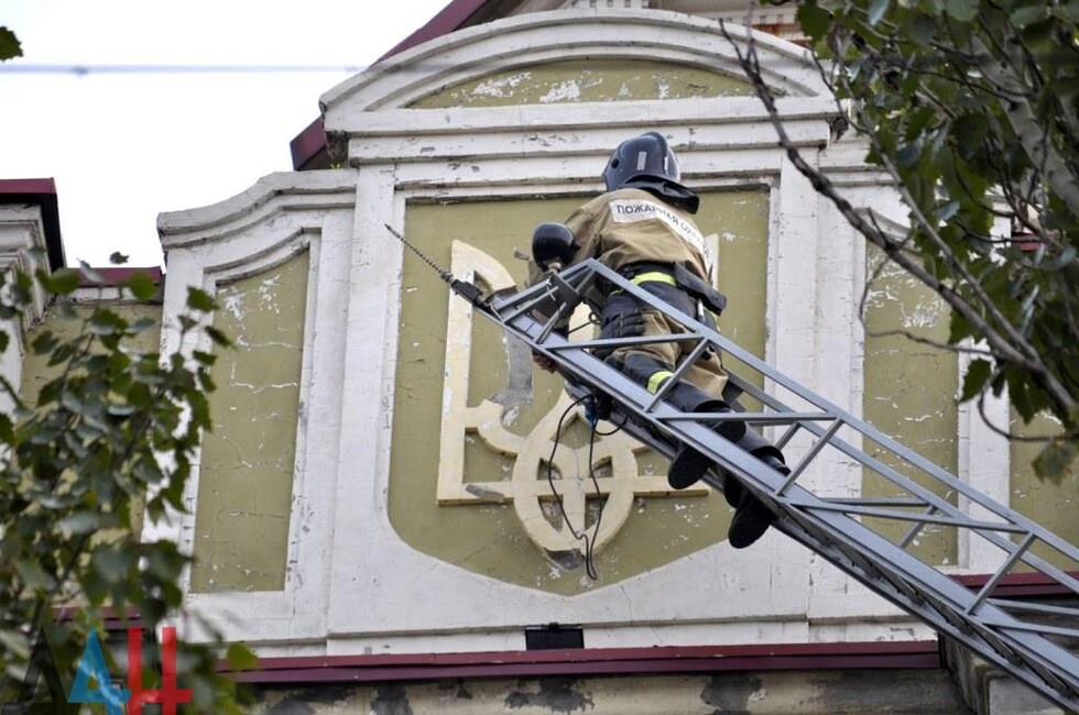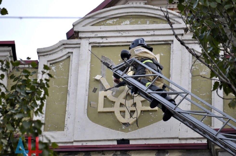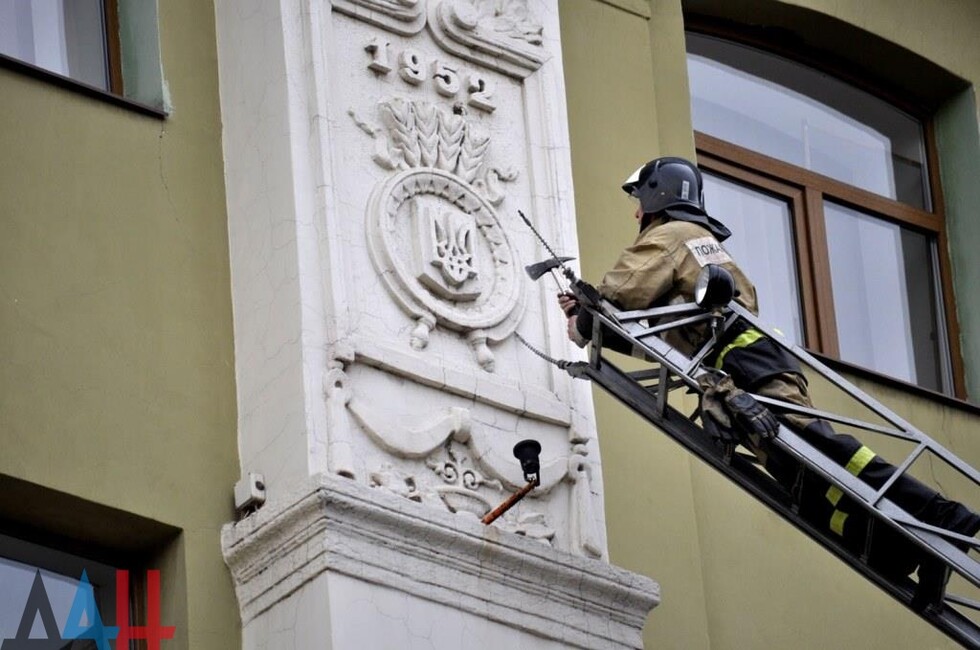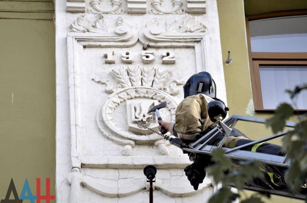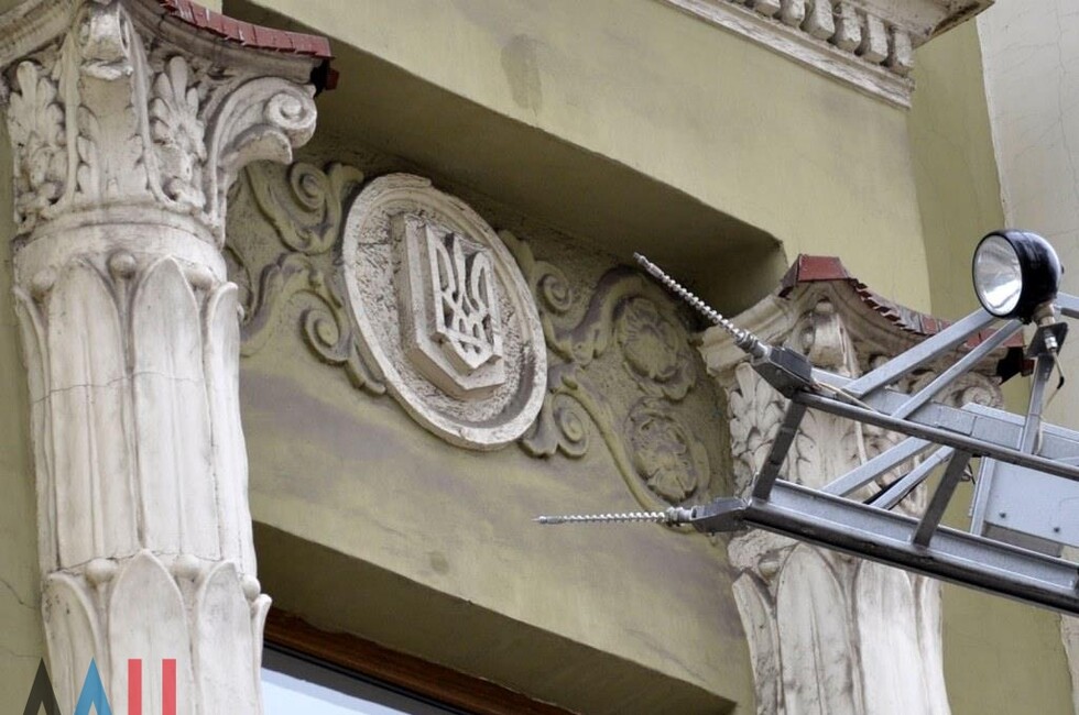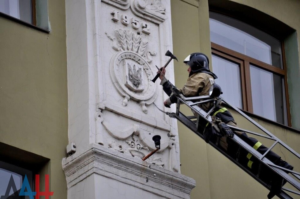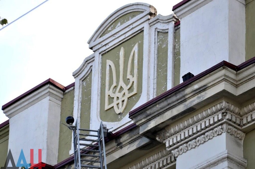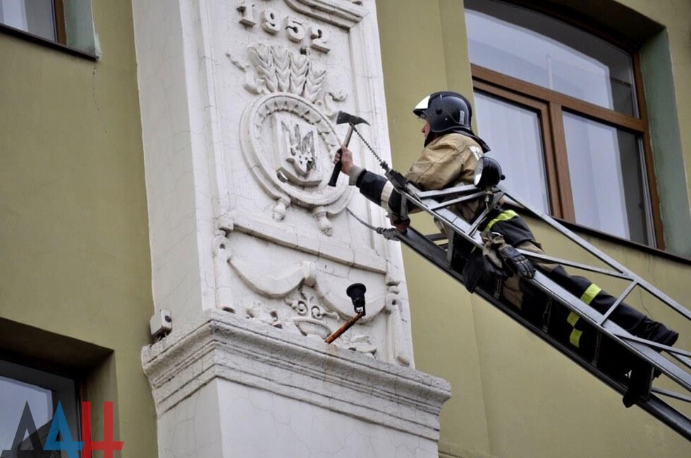 Донецк, 25 окт — корр. ДАН. Жители Донецка сегодня демонтировали четыре украинских герба с трезубцами со здания «Воды Донбасса» в центре столицы ДНР. За акцией наблюдало несколько десятков человек.