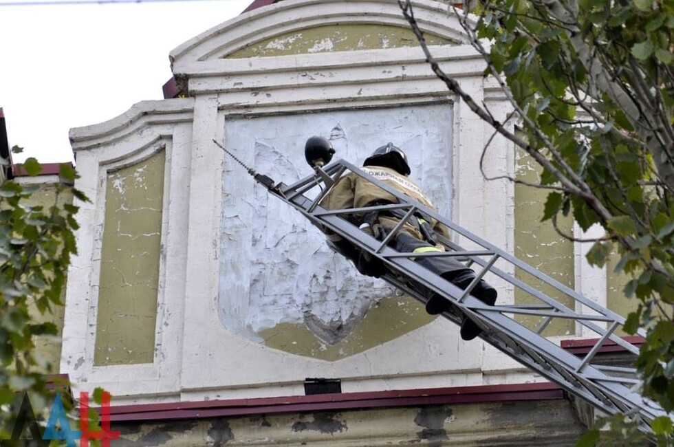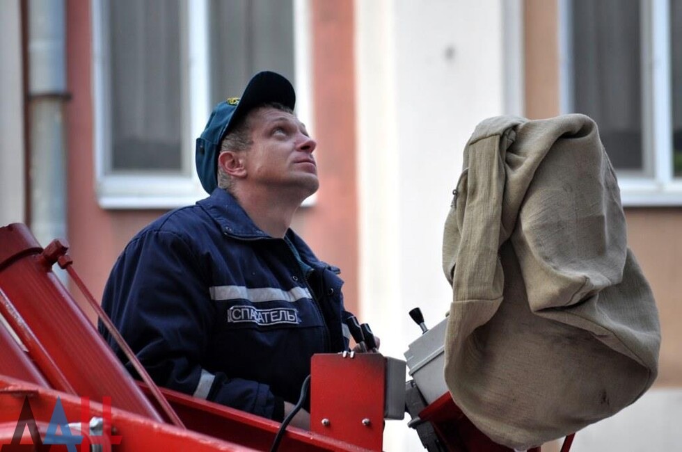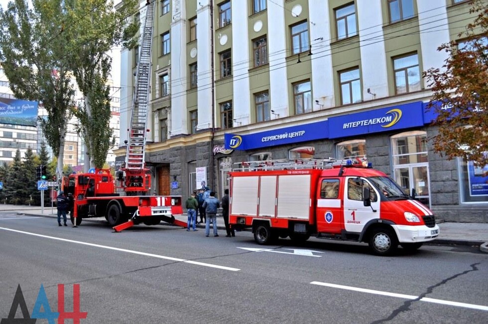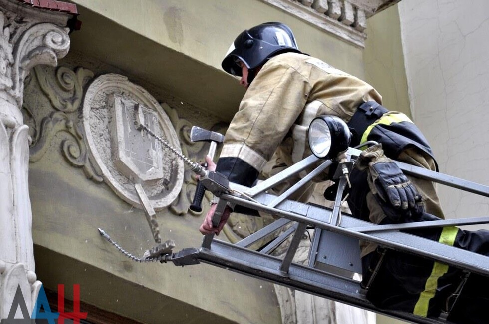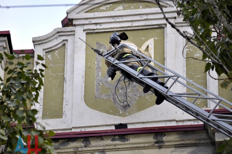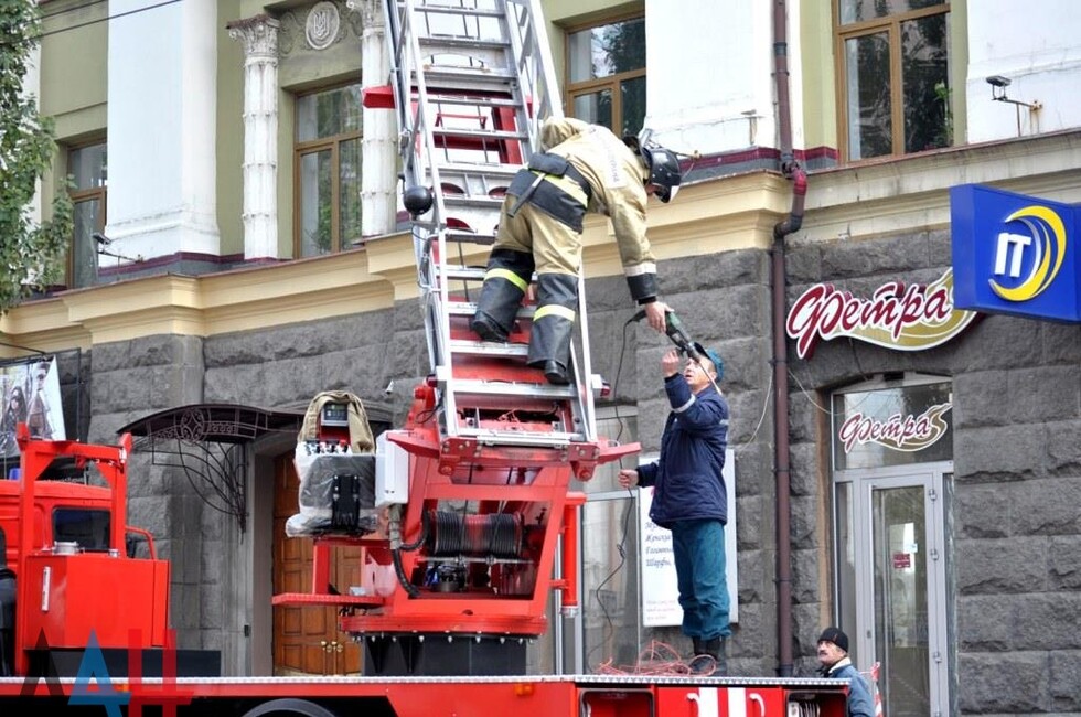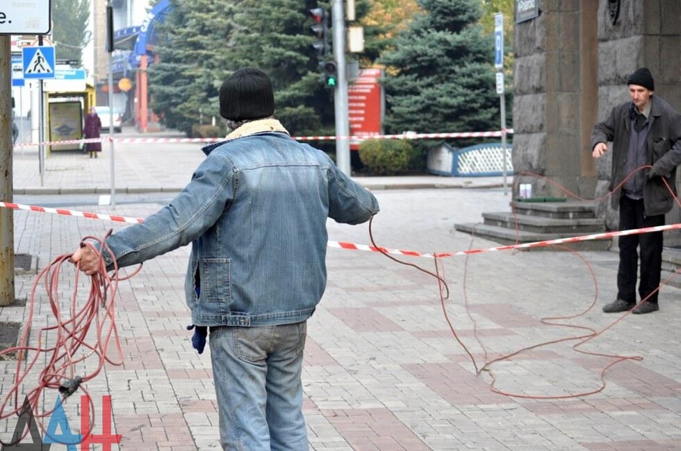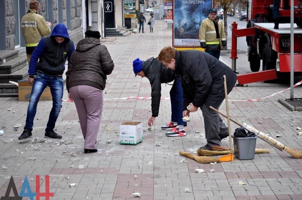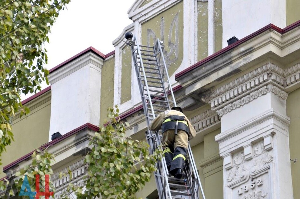 Донецк, 25 окт — корр. ДАН. Жители Донецка сегодня демонтировали четыре украинских герба с трезубцами со здания «Воды Донбасса» в центре столицы ДНР. За акцией наблюдало несколько десятков человек.