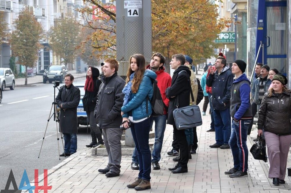 Как пояснили корр. ДАН собравшиеся, это одни из последних образцов украинской символики, которые остались в Донецке. «Где же ее взять? Их символов и гербов в ДНР сегодня после года войны практически не найти», – ответил один из активистов на вопрос, будет ли убрана с улиц Донецка другая символика Украины.