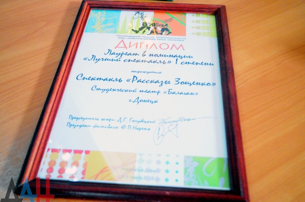 «С 5 по 9 июля в Ростове проходил Международный фестиваль студенческих театральных постановок «Театральная вольница» и ребята из театра ДонНУ «Балаган» привезли первое место, - отметил замминистра. - Очень показательно, что настолько молодые ребята уже на профессиональном уровне представляют Республику на подобных фестивалях. Диплом победителя коллективу вручал Народный артист РФ Эммануил Виторган».