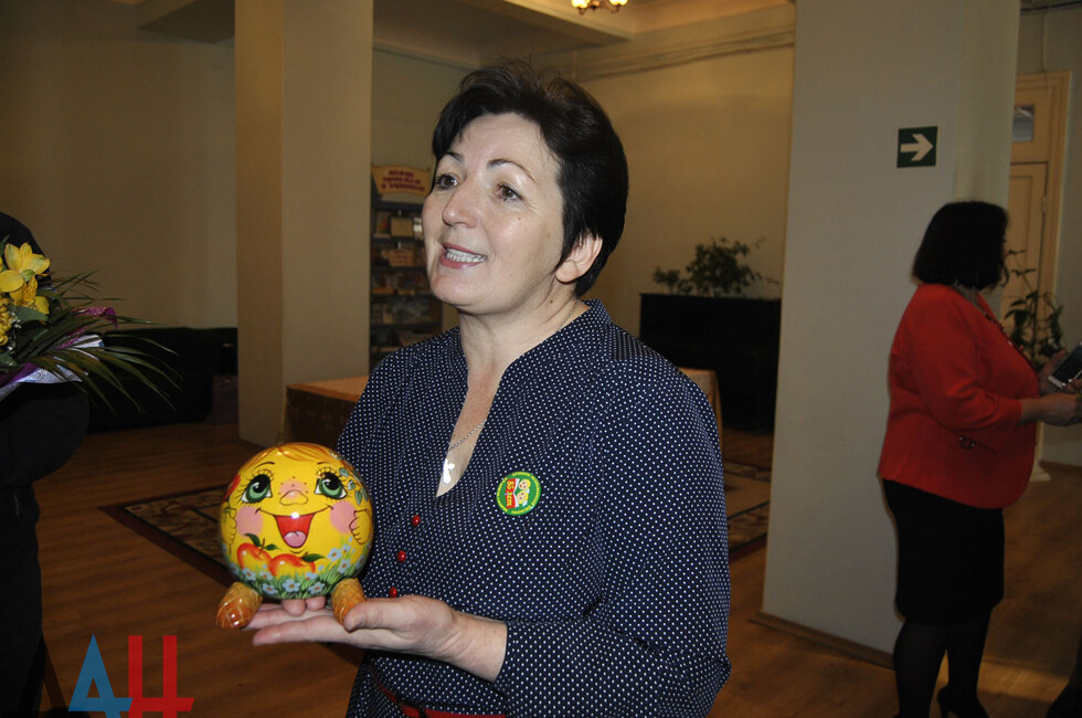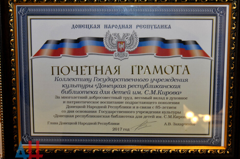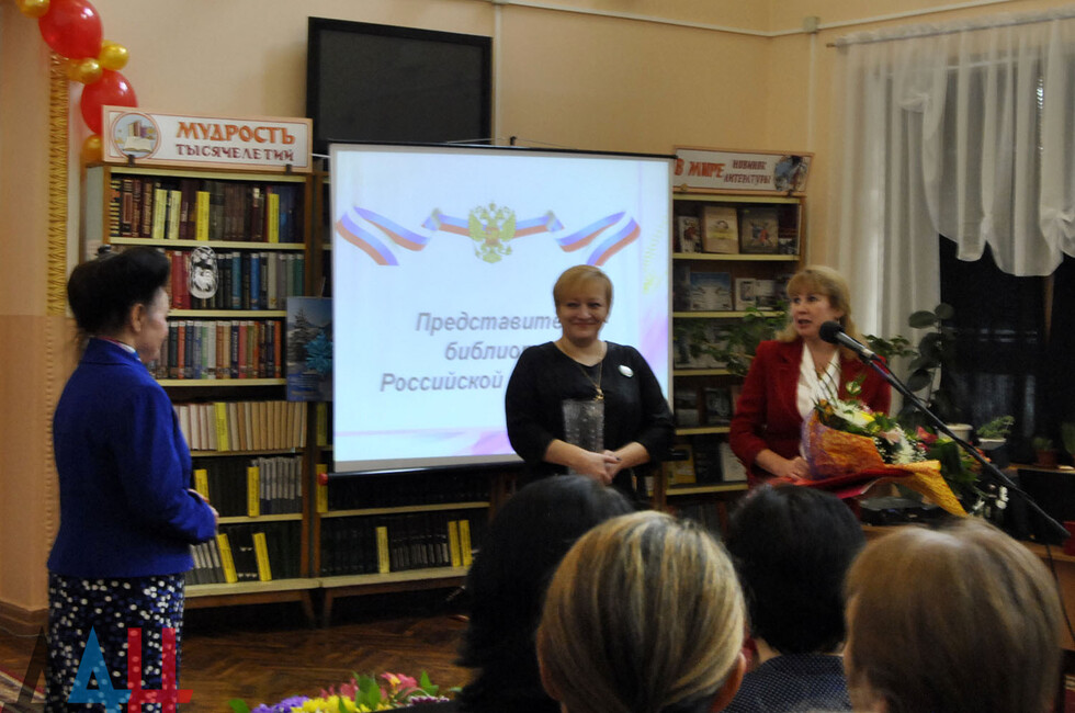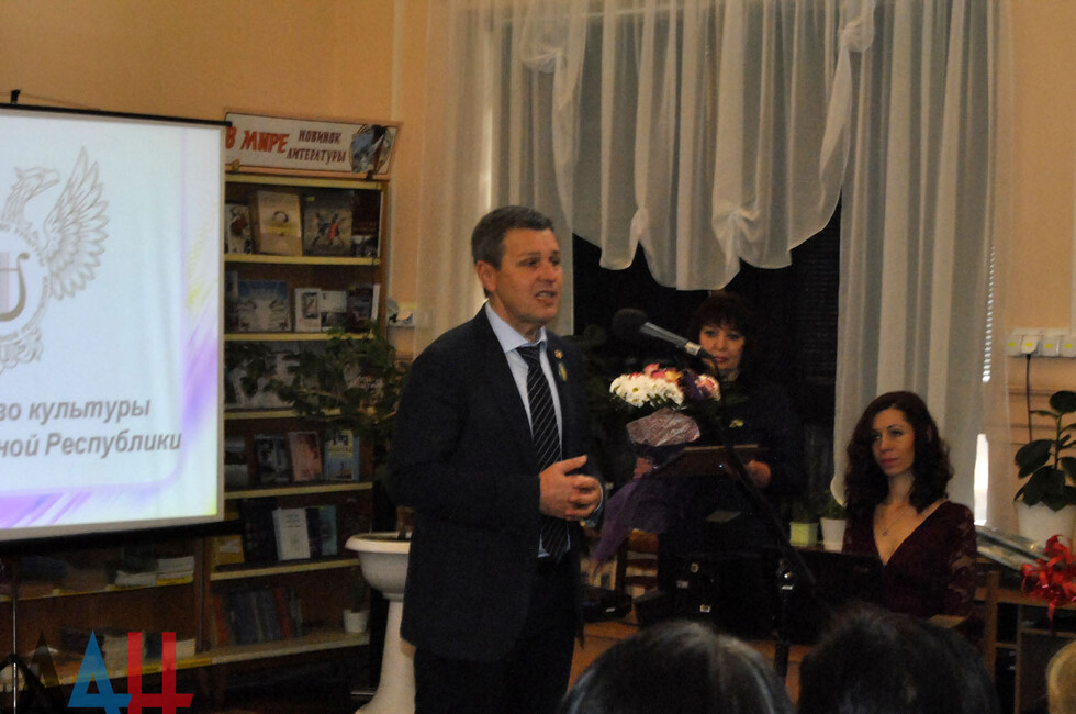 Мероприятие началось с официальных поздравлений. Желтяков зачитал поздравительный адрес Главы ДНР Александра Захарченко коллективу библиотеки и вручил учреждению Почетную грамоту. Также сотрудники учреждения получили грамоты Минкультуры.