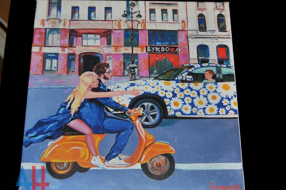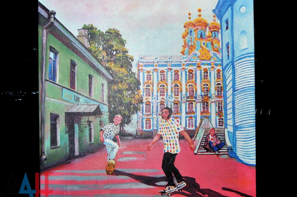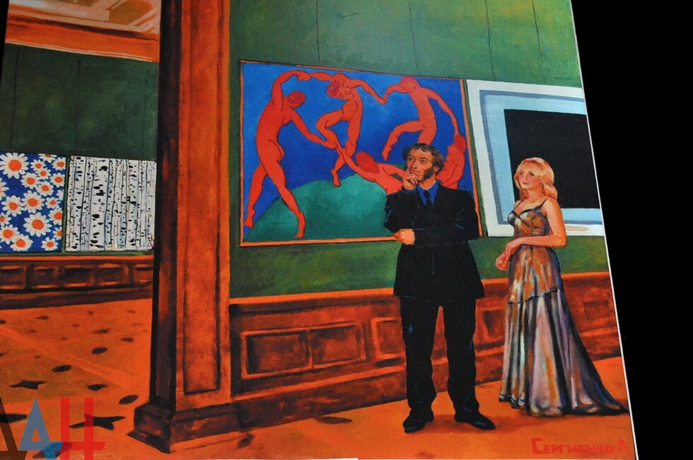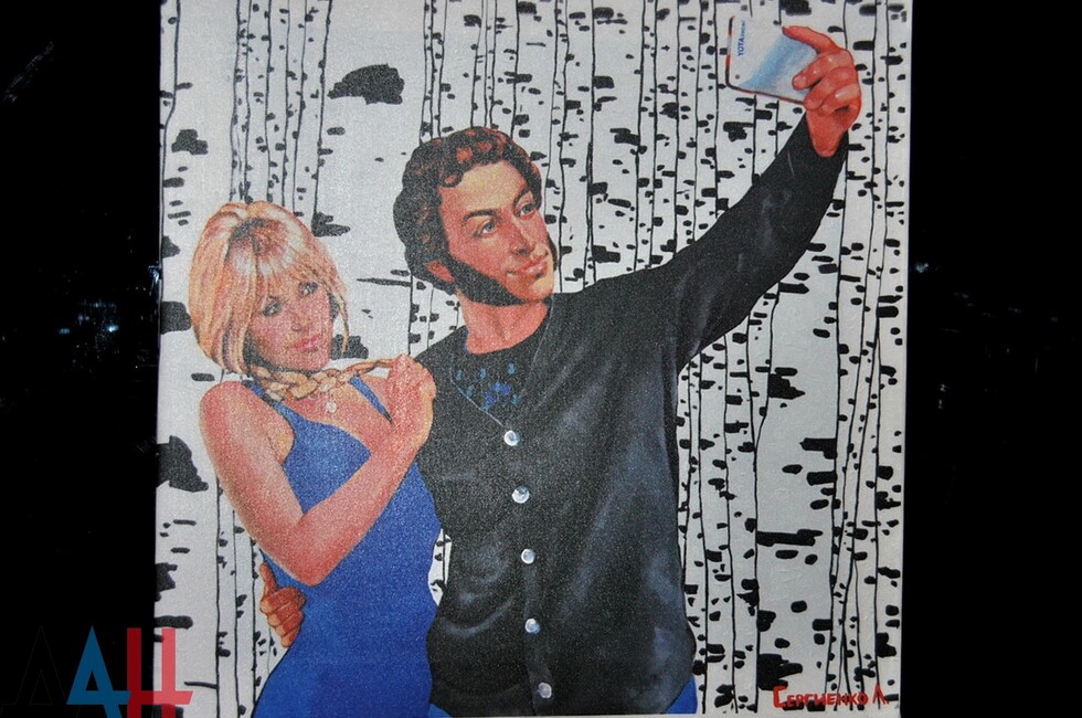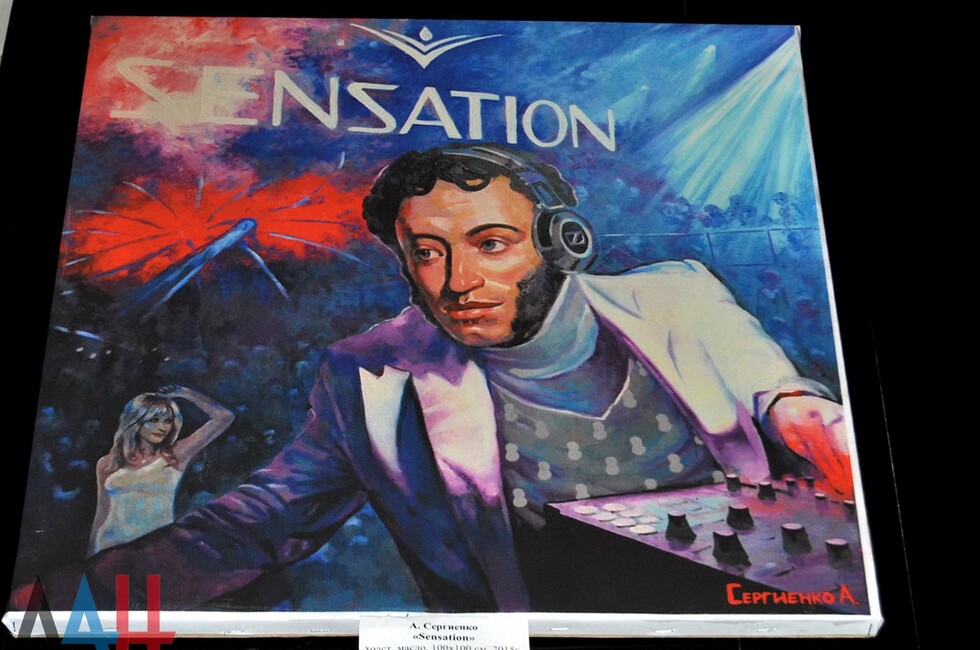 Экспозиция «Новый Пушкин» включила больше десятка работ санкт-петербургского авангардиста, на которых поэт представлен нашим современником. Одна из этих картин использовалась в оформлении программки к спектаклю «Навсегда-навсегда», который впервые был сегодня представлен донецкому зрителю.