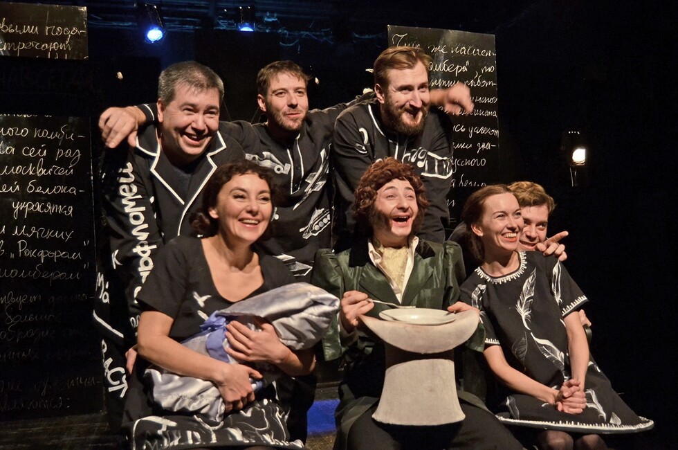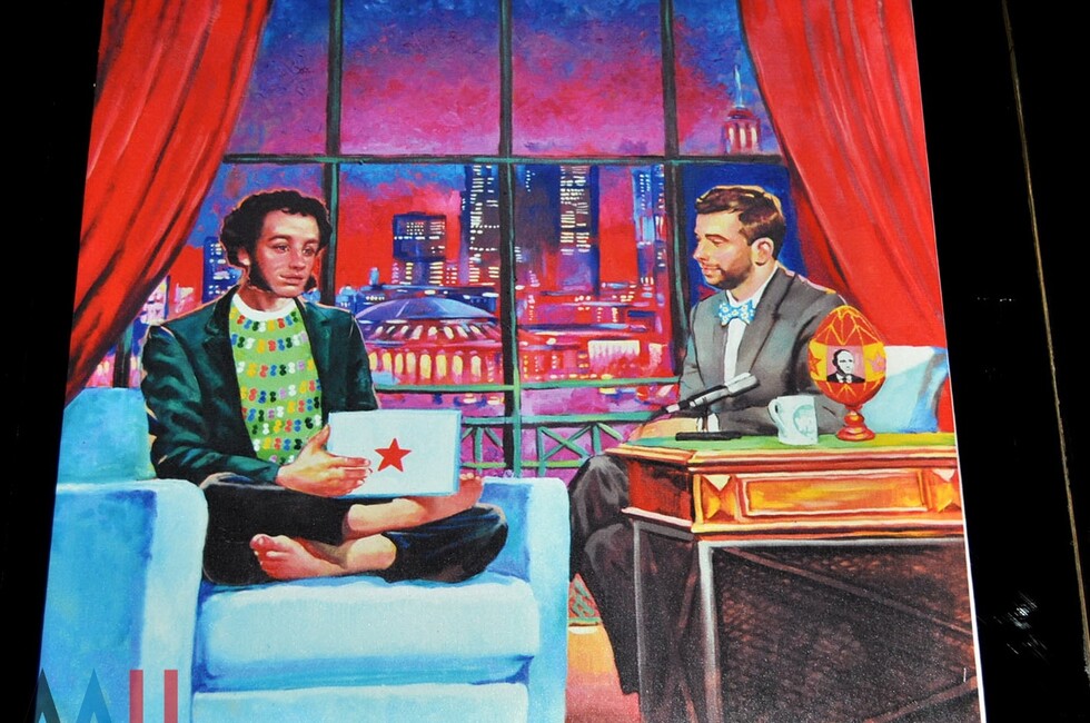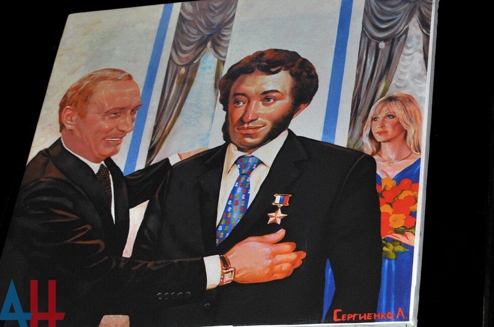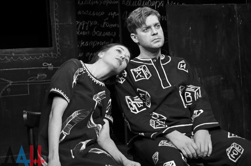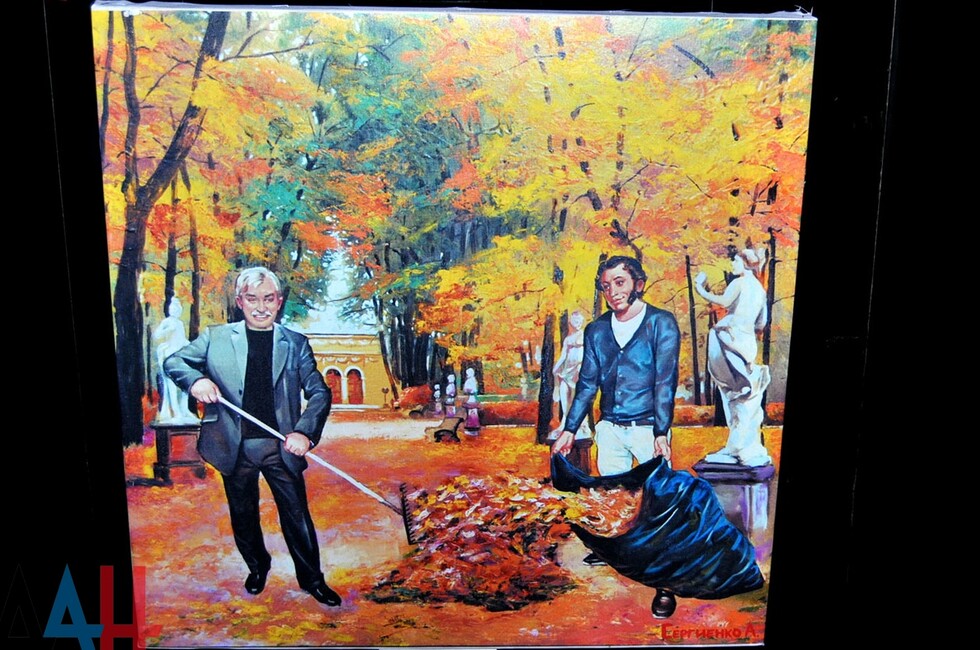 Экспозиция «Новый Пушкин» включила больше десятка работ санкт-петербургского авангардиста, на которых поэт представлен нашим современником. Одна из этих картин использовалась в оформлении программки к спектаклю «Навсегда-навсегда», который впервые был сегодня представлен донецкому зрителю.