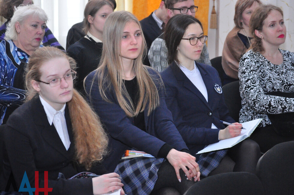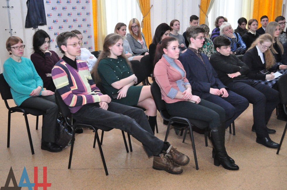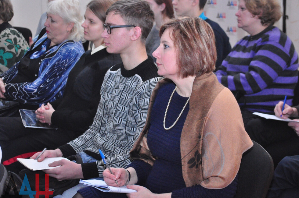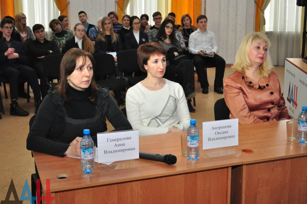 В пресс-центре собрались 25 школьников из Донецка, Макеевки и Харцызска, на связи из Луганска были учащиеся из городов ЛНР. Лектор рассказала об основных этапах подготовки к ЕГЭ, решении тестовых задач, системе оценивания и пр. Были рассмотрены примеры заданий и их решения.