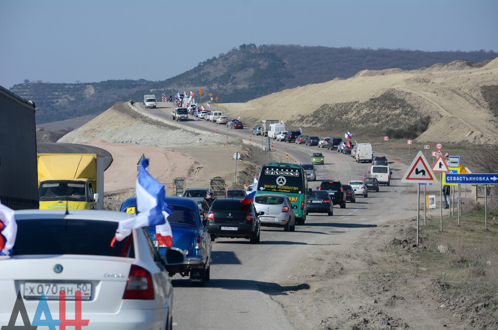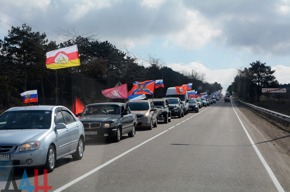 Участники пробега направились в город-герой Севастополь. Колонна растянулась на несколько километров, она включала сотни мотоциклов, автомобилей и автобусов. На них водители разметили флаги России, Крыма, а также Республик Донбасса. В состав колонны также вошел и автобус с журналистами Донецкого агентства новостей.