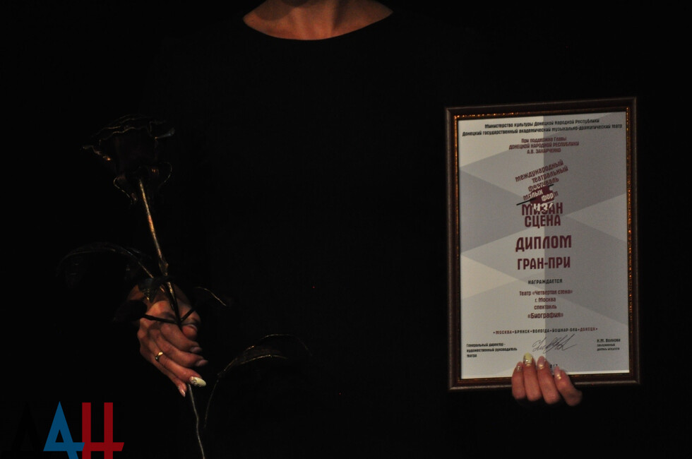 Донецк, 24 сен – ДАН. Театр из Москвы «Четвертая стена» за спектакль «Биография» по пьесе Макса Фриша получил гран-при I Международного театрального фестиваля малых форм «Мизансцена», что проходил в столице ДНР. Об этом на закрытии фестиваля сообщила генеральный директор Донецкой муздрамы, председатель жюри Наталья Волкова.