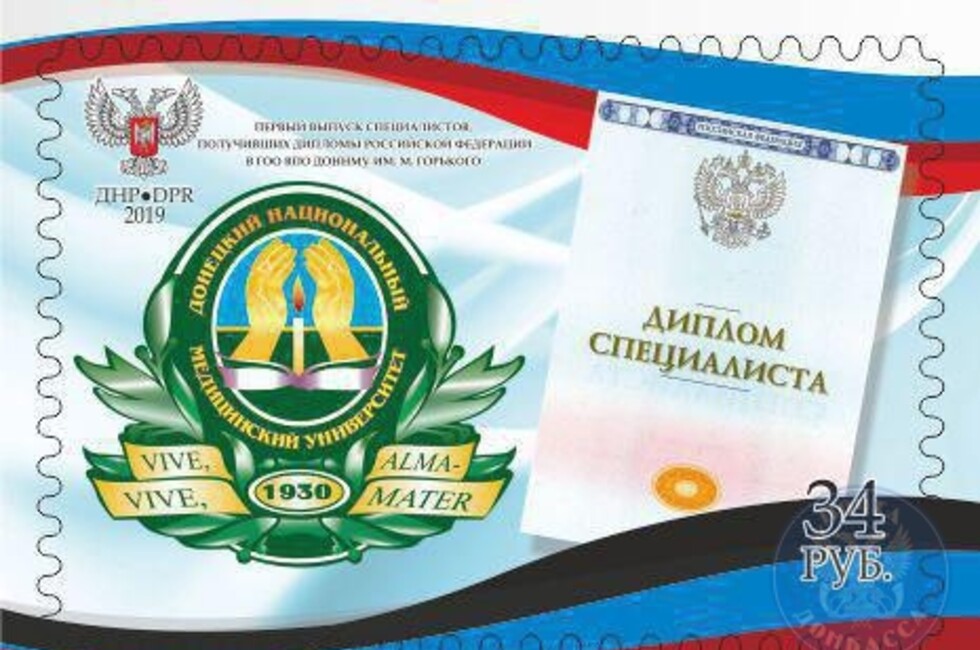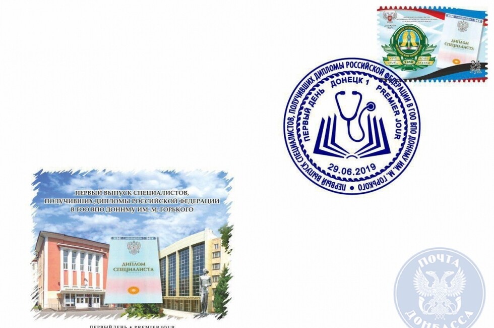 В честь памятного события ГП «Почта Донбасса» выпустило марку и конверт. На марке верхний и нижний края обрамляют флаги ДНР и России. Посередине изображен герб донецкого меда, который первым прошел аккредитацию в Рособрнадзоре, и обложка диплома специалиста. На конверте первого дня в правом нижнем углу изображены два корпуса столичного вуза и диплом РФ.