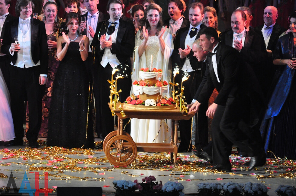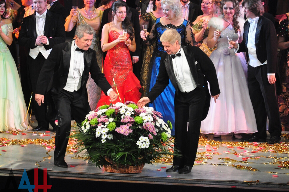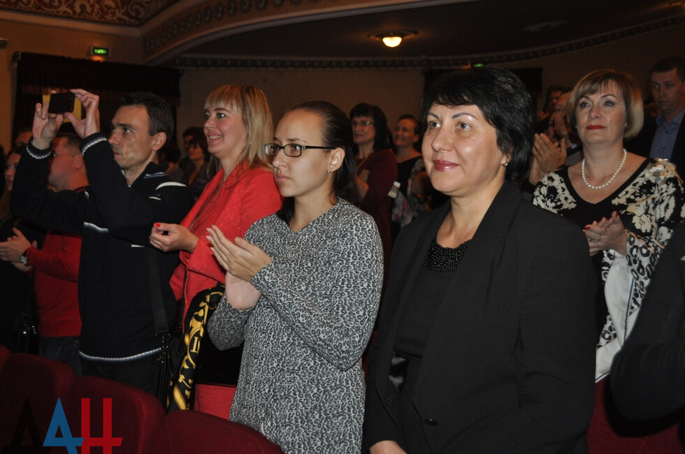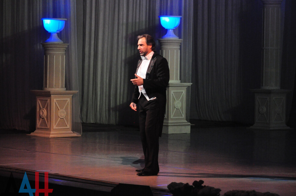 Желтяков зачитал со сцены поздравление от Главы ДНР Александра Захарченко. Также были зачитаны поздравительные адреса от Иосифа Кобзона и коллектива Большого театра.