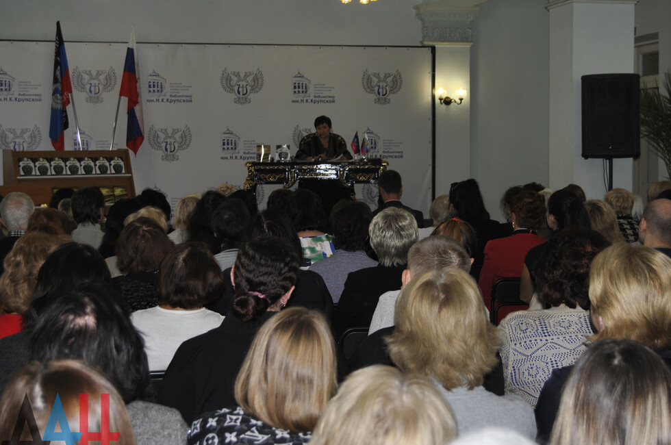 Творческая встреча поэтессы собрала полный лекционный зал библиотеки. Очирова читала стихотворения, отвечала на вопросы и делилась впечатлениями о Донецке.