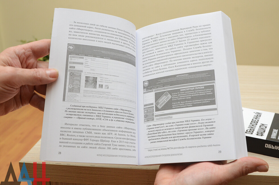 "Мы видели, как этот фашизм зарождался на "евромайдане", когда под лозунгами поддержки европейских ценностей мы видим совершенно обратное. Ни о какой свободе слова на Украине, естественно, речи не идет, - сказал он. - У меня целая глава книги посвящена "эскадронам смерти". Они используются на территории Украины для запугивания инакомыслящих, убийств политических противников. Свою задачу я вижу в том, чтобы максимально точно сохранить эту информацию для истории".