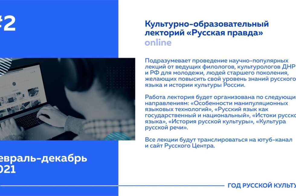 Мероприятия включают культурно-образовательные онлайн-лектории «Русская правда», онлайн-конференции о деятелях культуры РФ, научно-методические семинары экспертов из регионов России, мастер-классы артистов народных фольклорно-этнографических коллективов РФ, очно-заочные встречи писателей, фестиваль народной культуры «Дни России в Донбассе», конкурс «Корреспондент Русского центра».
