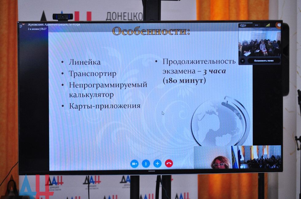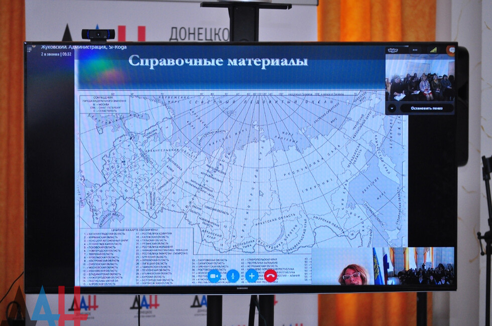 «Сегодня – восьмая видеоконференция. Она посвящена подготовке к ЕГЭ по географии. Все мероприятия в этом цикле проводятся в рамках интеграционной программ при поддержке Русского центра. У нас на географию из ДНР зарегистрировалось 11 учащихся из различных образовательных организаций», – сказала журналистам главный специалист отдела общего и среднего образования министерства образования и науки ДНР Ольга Тюрикова.