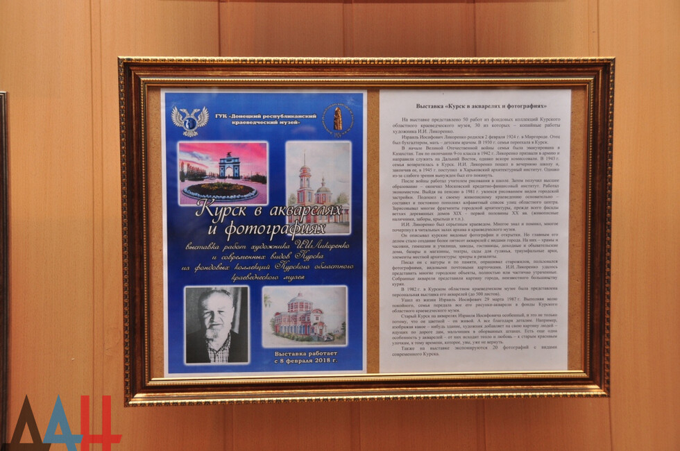 Донецк, 8 фев – корр. ДАН. Копии тридцати акварельных рисунков советского художника и краеведа Израиля Ликоренко и двадцать фотографий современной архитектуры Курска украсили сегодня стены одного из залов Донецкого республиканского краеведческого музея в Донецке. Экспозиция открылась в честь 75-й годовщины освобождения русского города от немецко-фашистских захватчиков, которая отмечается 8 февраля.