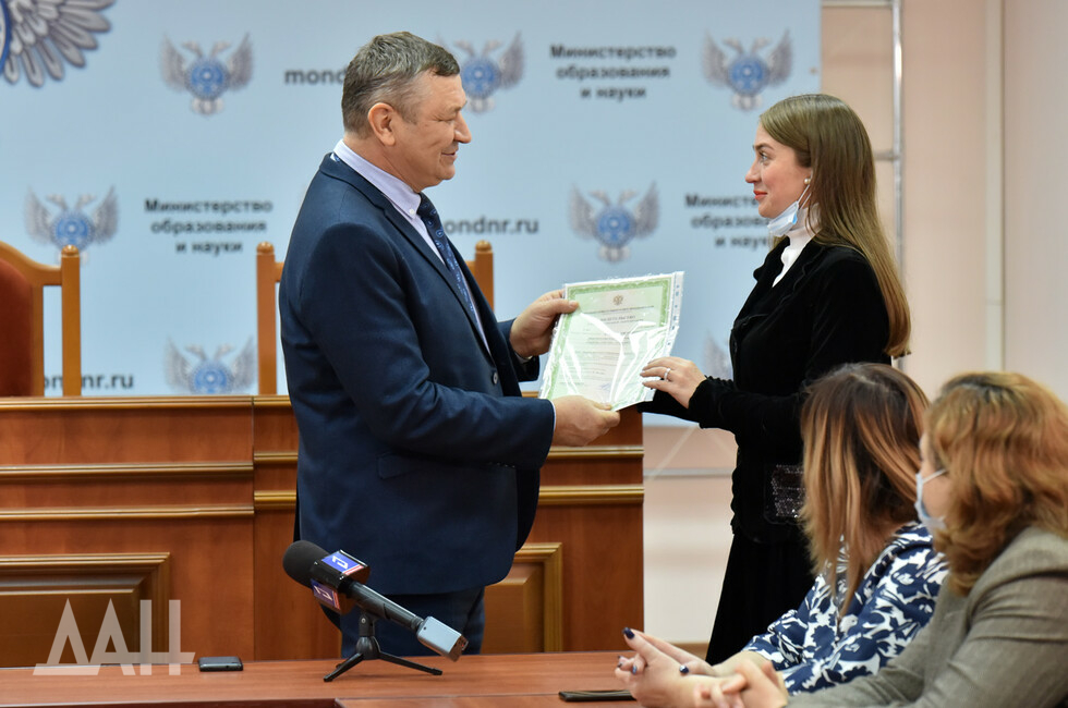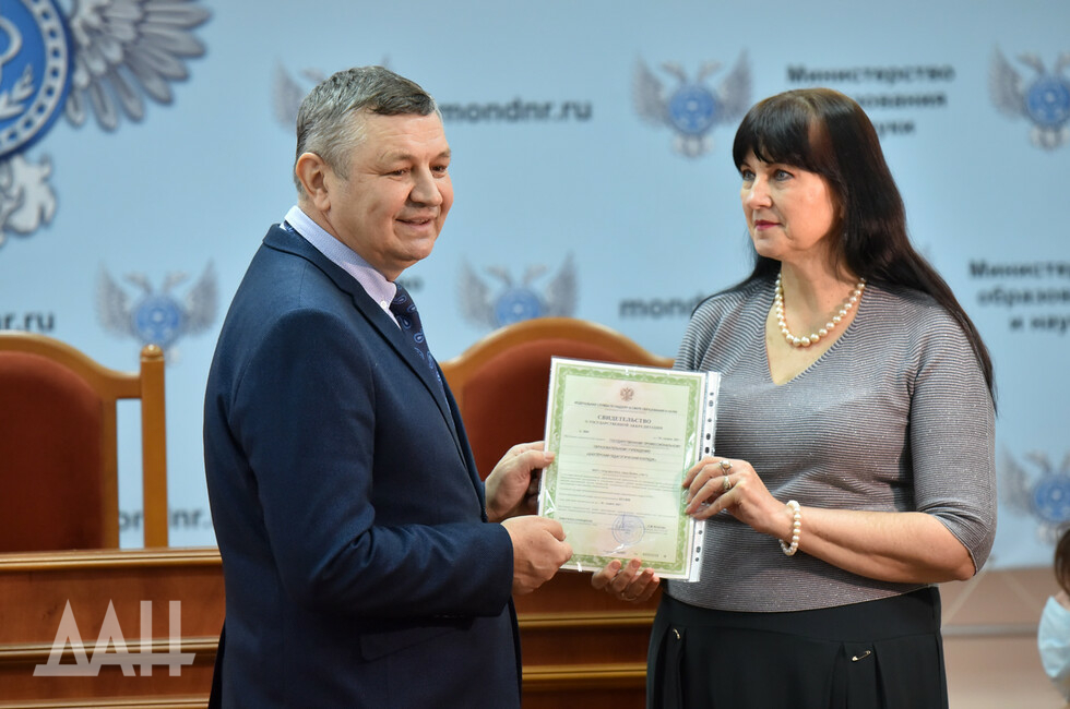 Кроме того, министр вручил свидетельства Федеральной службы по надзору в сфере образования и науки о государственной аккредитации образовательных программ представителям Донбасской национальной академии строительства и архитектуры, Шахтерского педагогического колледжа, Донецкого колледжа ресторанного сервиса и торговли, лицея №2 «Престиж» города Макеевки.