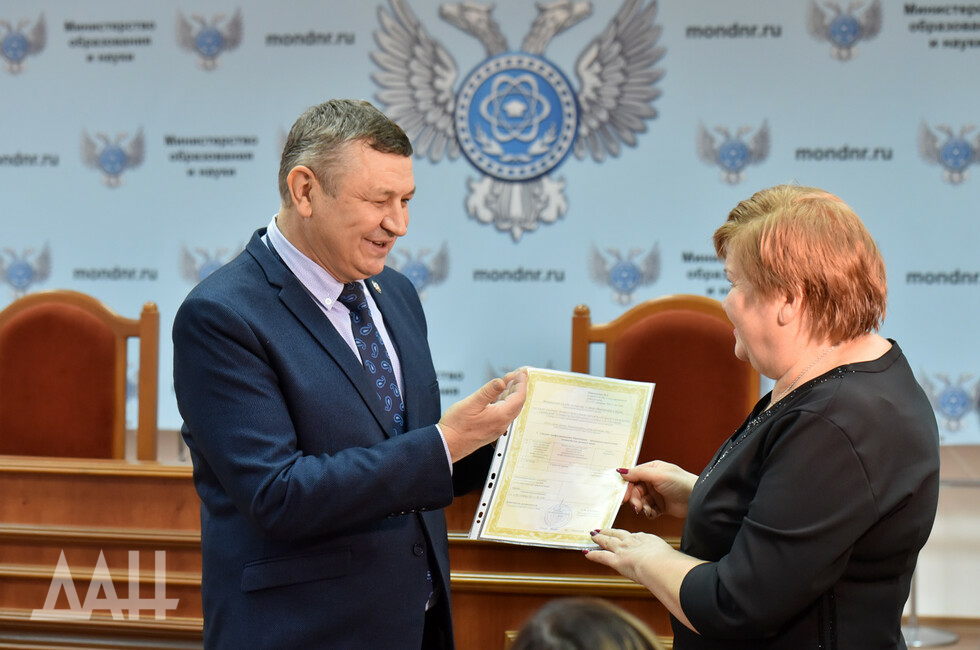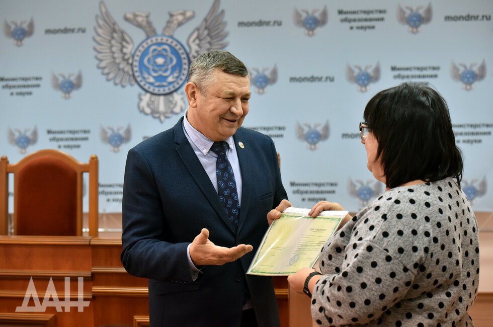 Донецк, 30 дек – корр. ДАН. Вручение российских удостоверений о повышении квалификации и свидетельств о государственной аккредитации прошло сегодня в конференц-зале министерства образования и науки ДНР. Как передает корр. ДАН с места события, документы вручал глава министерства Михаил Кушаков.