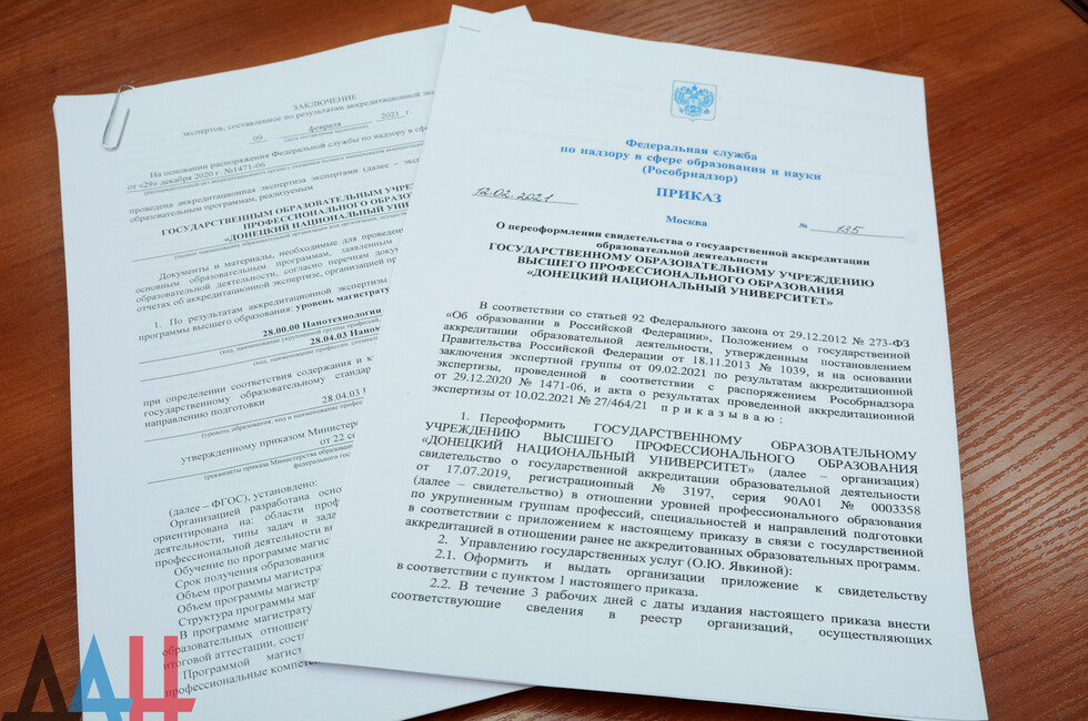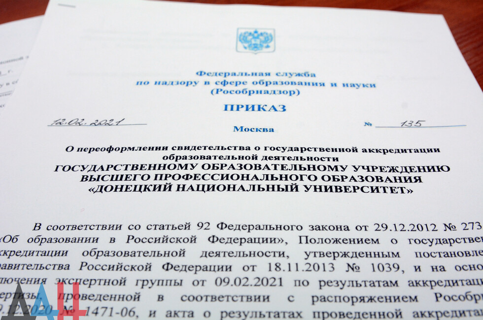 «Донецкий национальный университет фактически завершил российскую государственную аккредитацию по всем направлениям учебы. Теперь университет полностью работает по всем специальностям по российским образовательным стандартам и программам», – сказал журналистам руководитель ведомства.