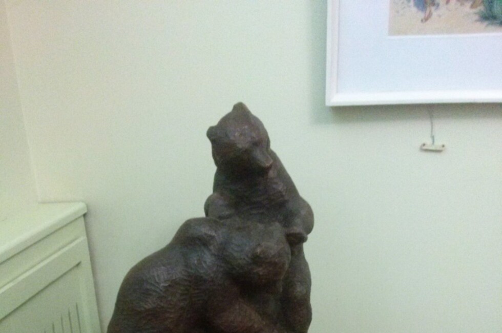 Экспозицию дополняют декоративные шкатулки из папье-маше и деревянная скульптура, иллюстрирующая сказку "Три медведя".