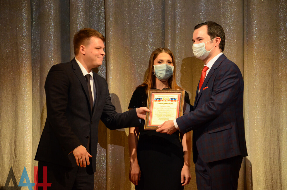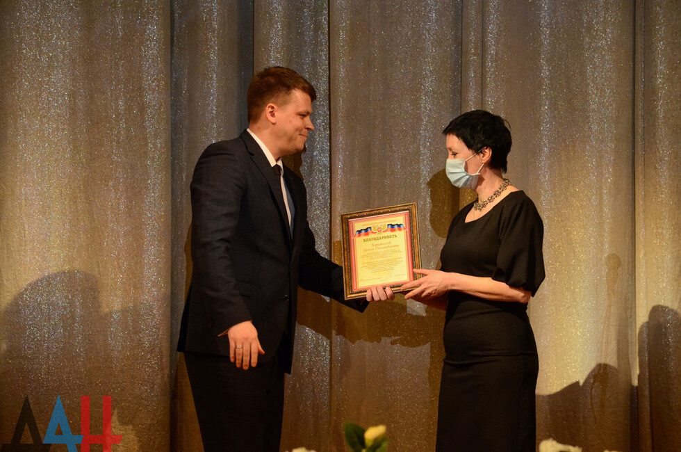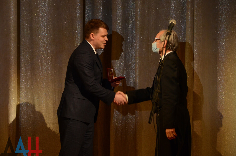 В начале артистов поздравил руководитель Администрации Главы ДНР Алексей Никоноров. Он зачитал поздравительный адрес от лидера Республики Дениса Пушилина. Затем началась церемония награждения. Медаль «За трудовую доблесть» получил концертмейстер симфонического оркестра им. Прокофьева Владимир Гамарь, который работает в филармонии свыше 50 лет. Грамотами и благодарностями Главы отмечены еще шесть ее сотрудников, в том числе гендиректор Александр Парецкий.